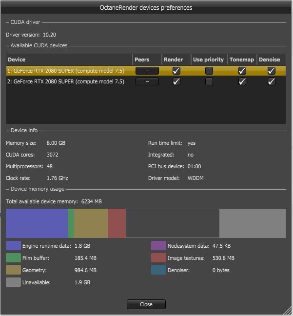 I just bought a new pc with 2xRTX 2080 super, with a connection between them (like SLI, I do not know much). When I am rendering octane uses only 1 of them.