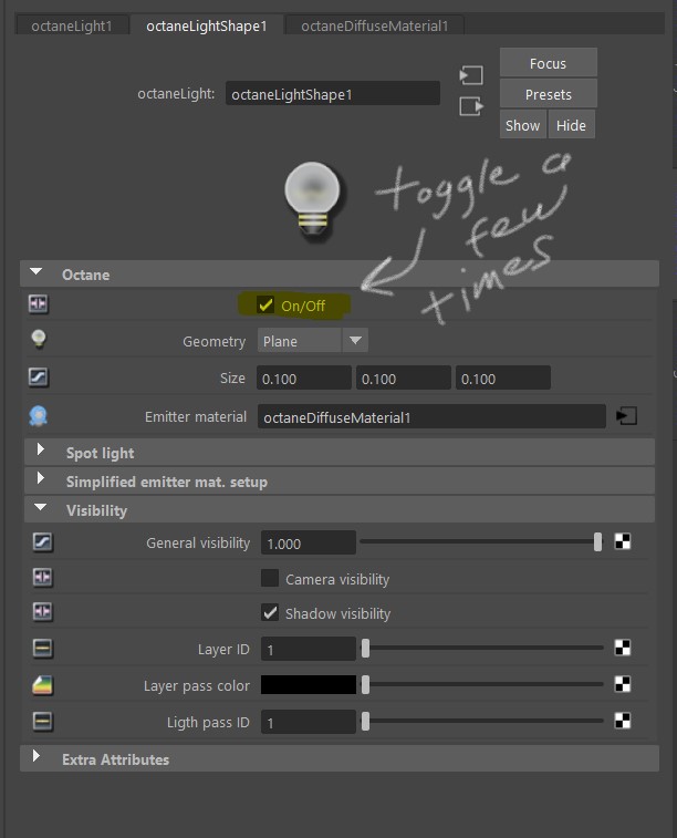 Hi. The camera visibility toggle on octane geometry lights, created via the octane panel, is broken and the lights always render directly in camera.