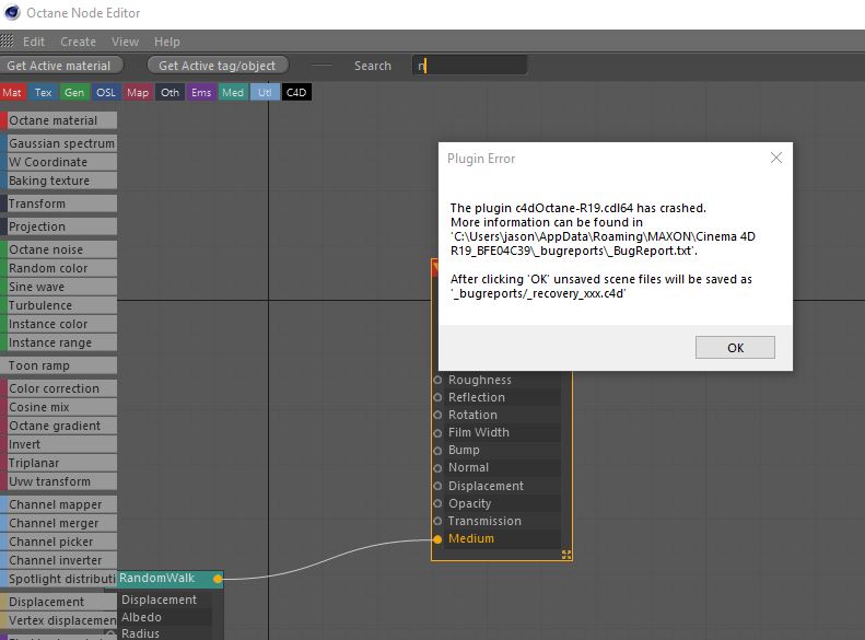 Every time I type into the search field in the node editor - Octane crashes. I'm running a PC Windows 10, C4D R19.