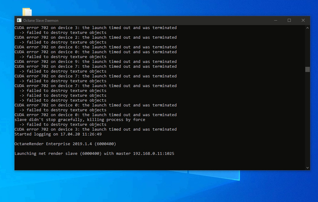 Anyone seen this one before and/or know how to fix it? Happens when when we use our machine as a slave, seems ok when rendering from an ORBX with standalone. Tried a few driver versions including latest 442.19 but no change.