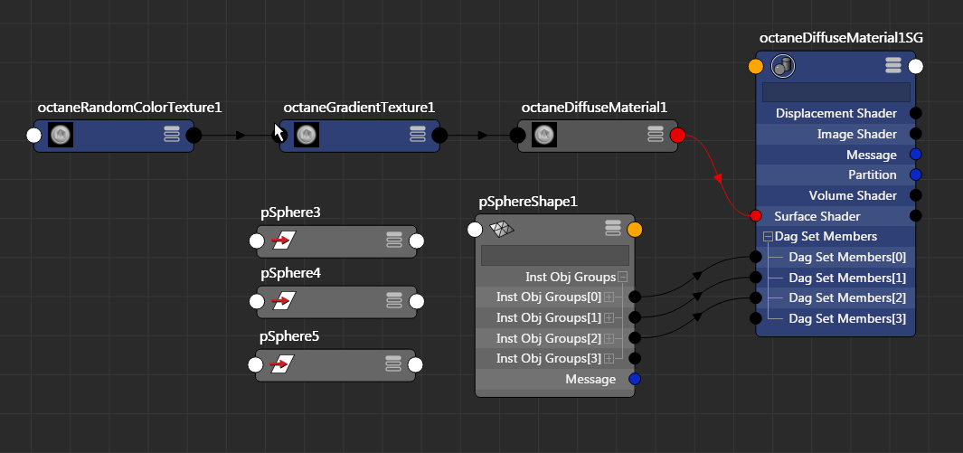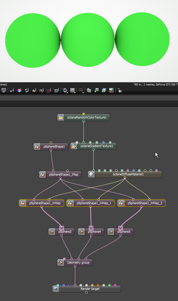 The sample scene attached has 3 regular instances using the same material with a random color node. So each instance is connected to the same shading group in Maya: When exporting the scene as ORBX we can see in Standalone the problem and why the Bug happen: The geometry instance is conected to 3 shaderMap but should only use one like this: So to fix this bug : Instances using the same Shading Group in Maya must be exported to Octane as geometry using the same Material Map node.