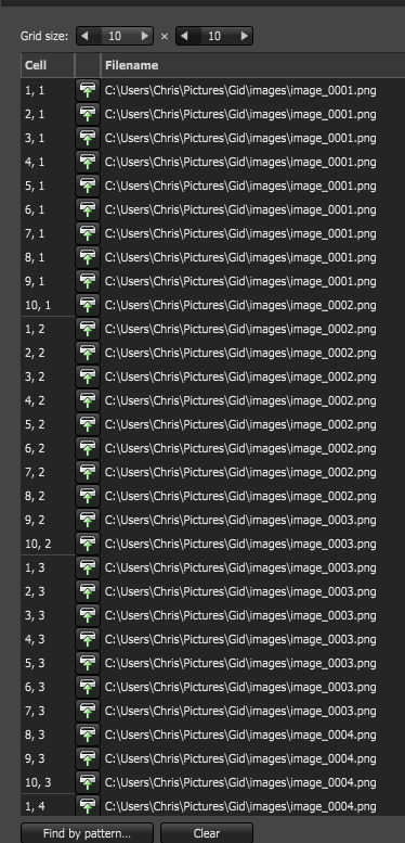 I have set the pattern to "image_%i.png" via the Image data-block name, and Grid to 10x10, Start to 1 and Digits to 4