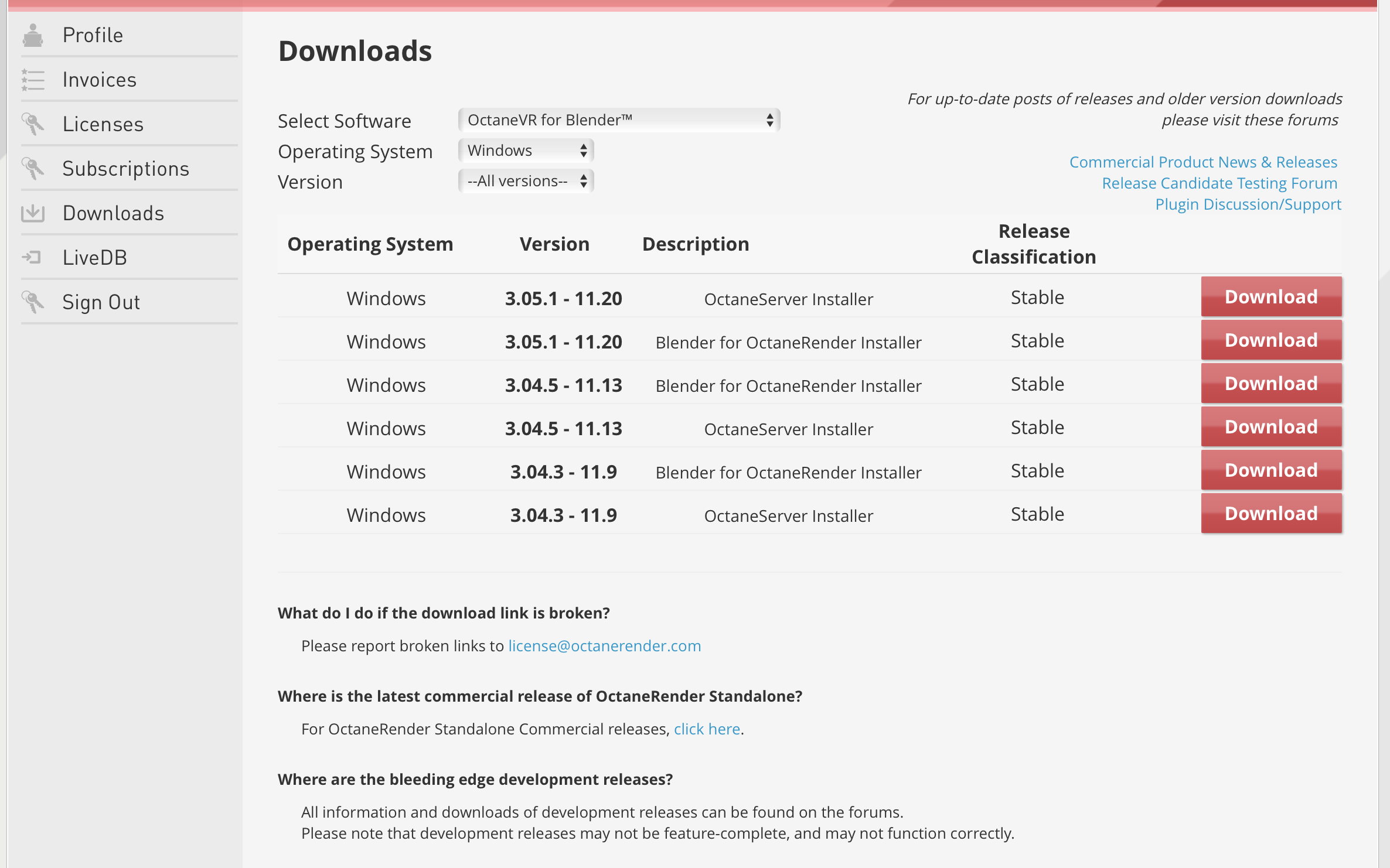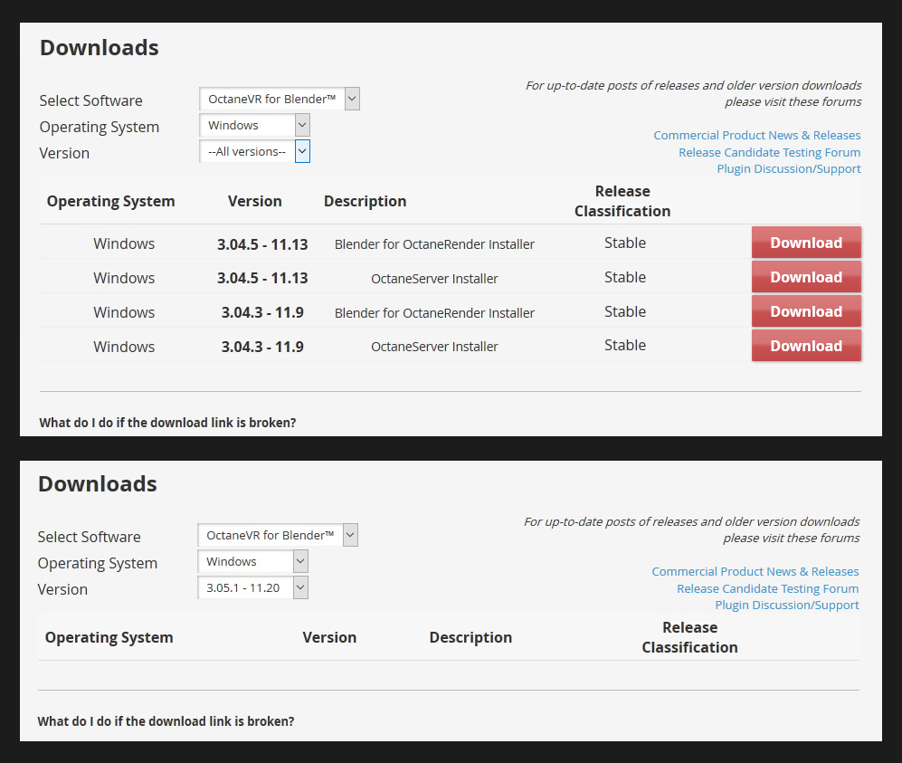 Unfortunately the last stable build doesn't show up, and I saw that someone else can't see that version as well (and sees my same version). In this thread to be exact, the last post: viewtopic.php?f=32&t=57883&hilit=octanevr&start=10