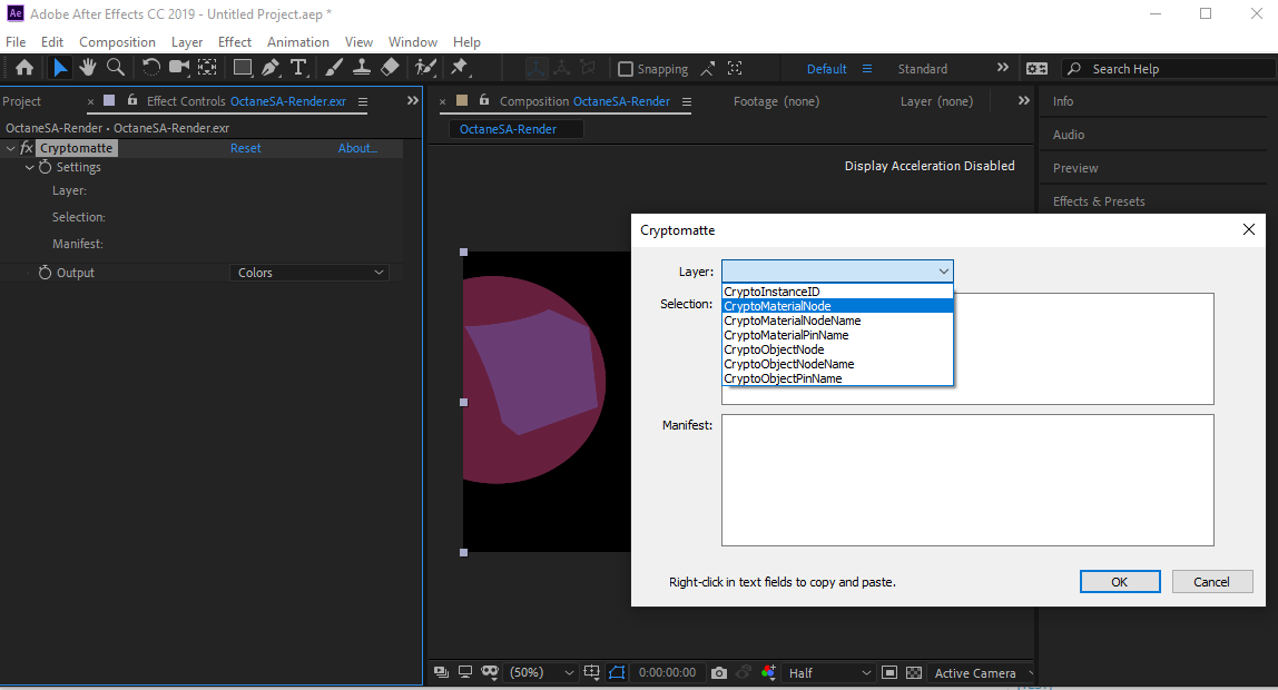 Cryptomatte passes don’t seem to render correctly in Octane Blender 2018.1 / 17.6. When I bring the files into After Effects, the Cryptomatte plug in doesn’t detect them.