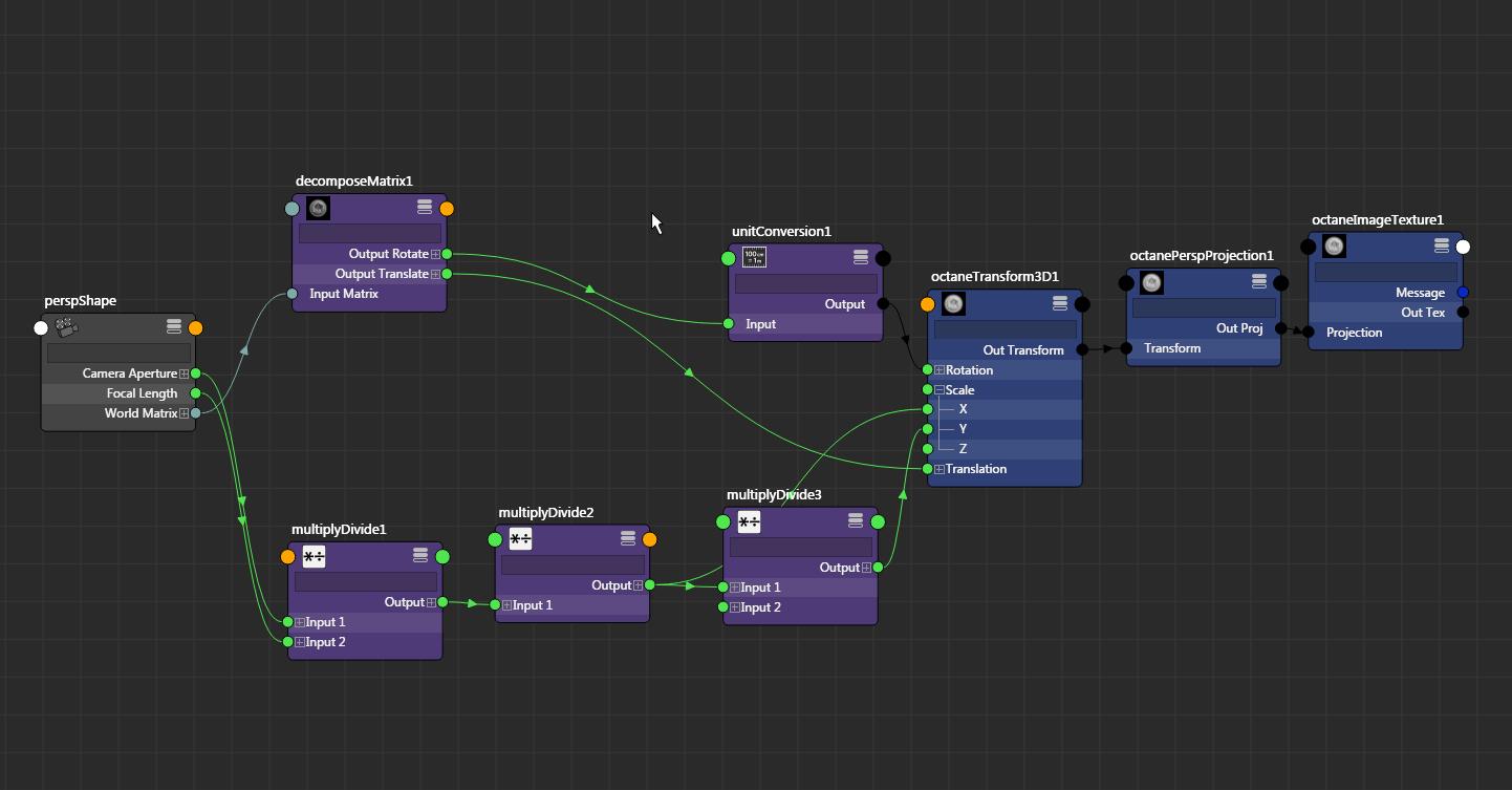 So, here is a python script to project any Image or procedural texture from the current camera: Edit: v 0.2 added more nodes for Octane scale factor and Maya units. Edit: v 0.3 updated for recent octane plugin, indice of world space coordinate have changed from 0 to 1.