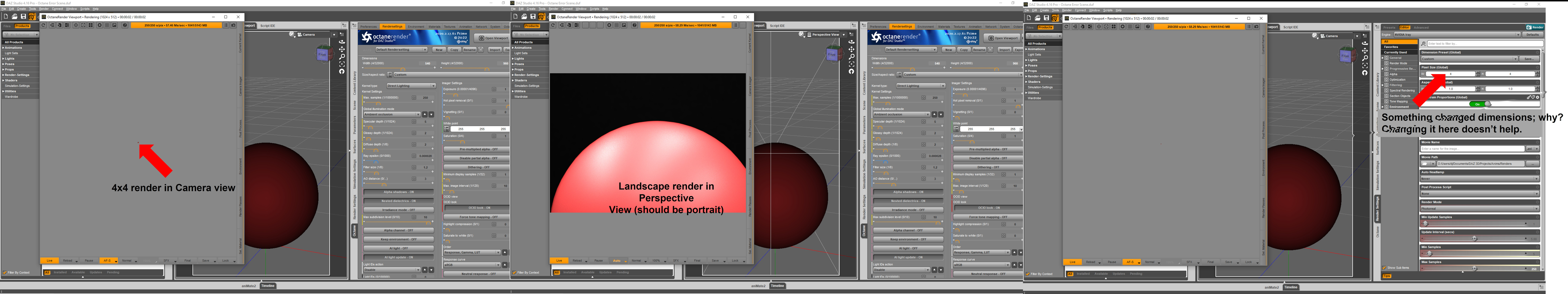 At unpredictable times Octane renders incorrect dimensions. Today it happened when I was using LiveDB but that may just be a coincedence. As shown in the screenshots (left to right) it renders 4x4 in Camera View (any camera), and landscape in Perspective View even though Octane render settings are 540x960 (portrait). DAZ Studio render settings were changed to 4x4 and even if I change back to 540x960 or anything else, Octane continues to render 4x4 for cameras and landscape for Perspective view. It does correctly follow Perspective View rotation in Live view ... only the dimensions are wrong). It does this for existing cameras or new ones I add to the scene. Once this has happened for a scene, it continues whether I quit Studio and reload the scene or even if I restart my computer.