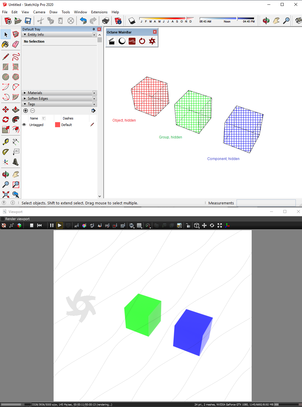 The Octane Sketchup plugin does not respect hidden groups and components, as shown: