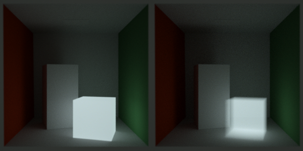 The following image shows a normal mesh emitter (left) and a volume emission (right). The emitter in the right side has specular