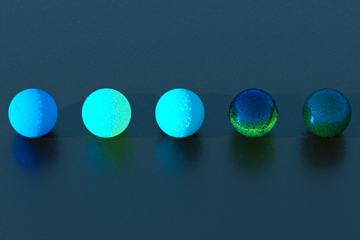 - sphere 3: blue diffuse + green transmission + sss (most visible on the shadowed side, because light is scattered back and the transmisson color gets less visible)