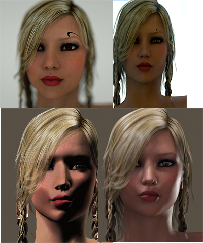 The top to pictures are of Faith and you can see over her right eye, there is a black area, almost like a tattoo, which is not part of the figure or textures. Also, both pictures are from the Poser to Octane Plugin and a Poser export to OBJ/MTL then imported into the standalone Octane. Both produced the black area.