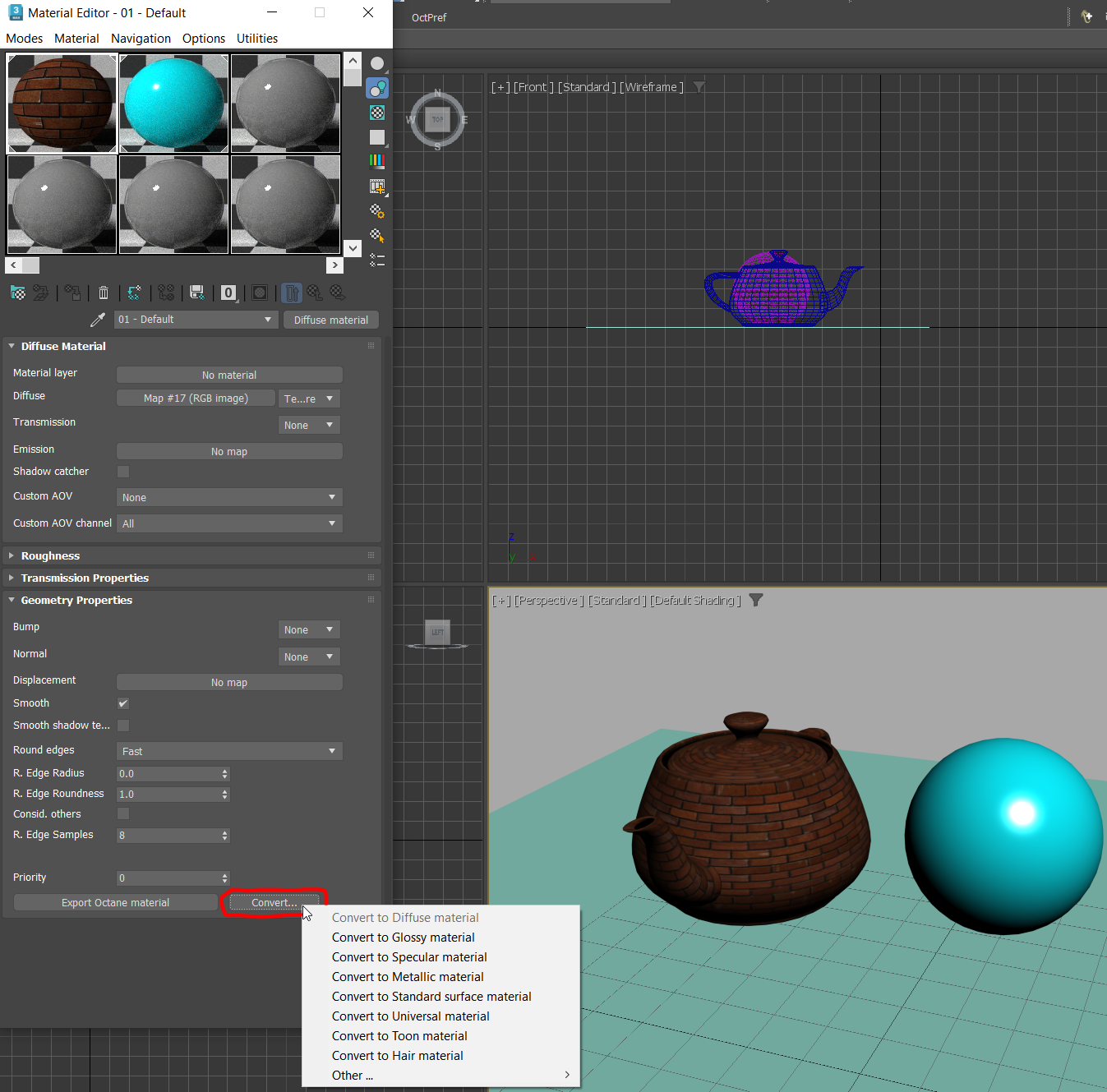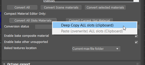 -For Octane materials, in the Context menu of the 'Convert...' button (Right click, instead of Left click)