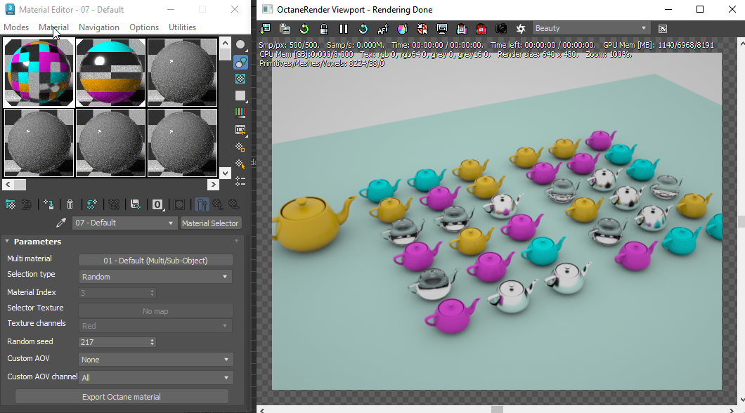 Another sample to illustrate the use of the Material Selector as an Octane interface to the 3dsmax Multi material.