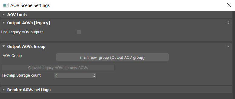 The new AOV Scene setting dialog has a single texmap, that is the main AOV Group where multiple AOV output can reside.