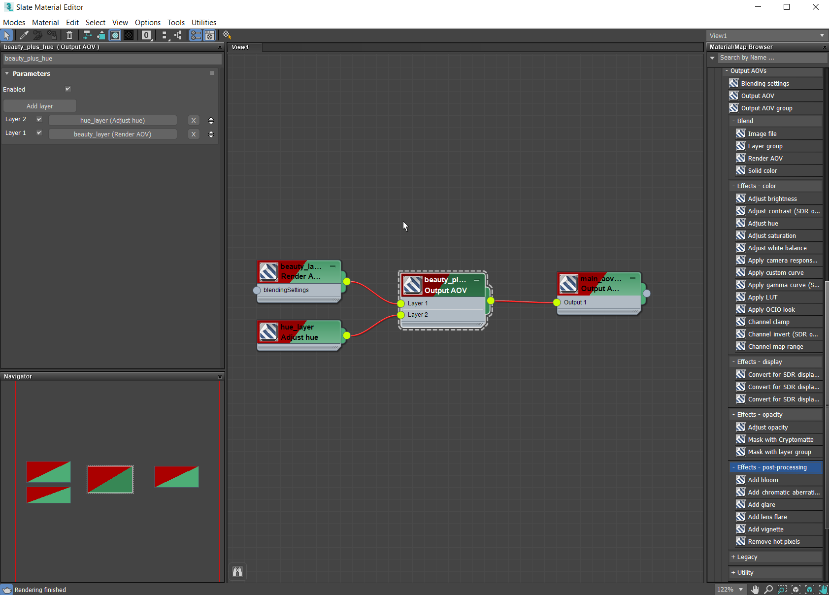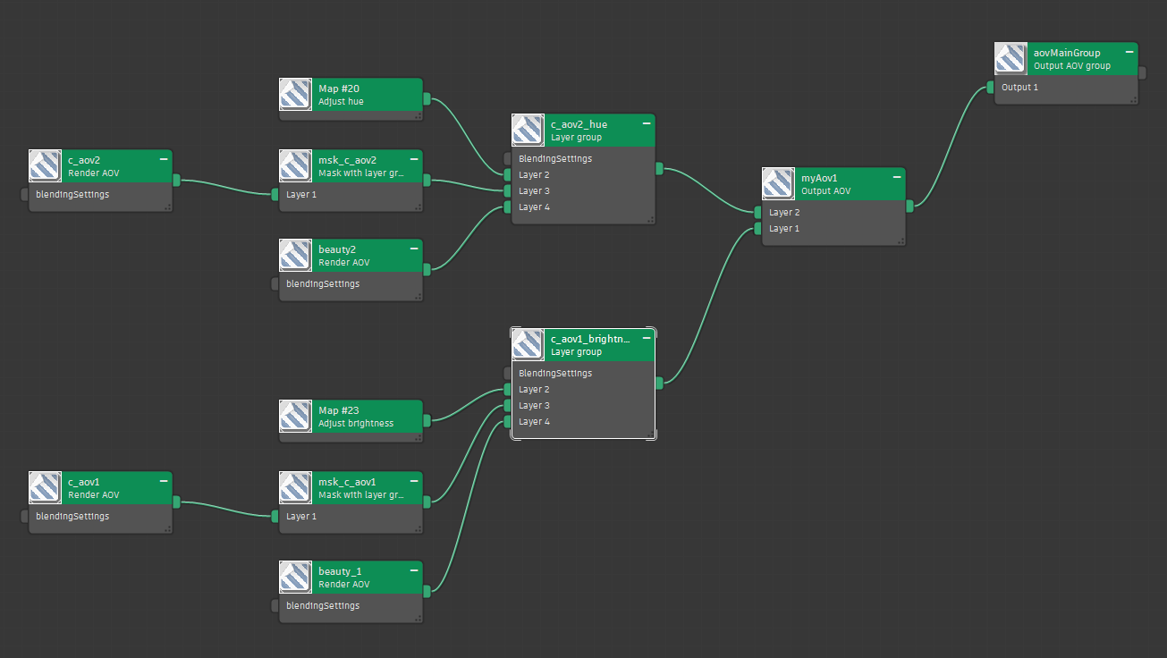 -For Layer 2, create a 'Adjust hue' map (in the 'Effects-color' category : Maps - Octane - Output AOVs - Effects-color)