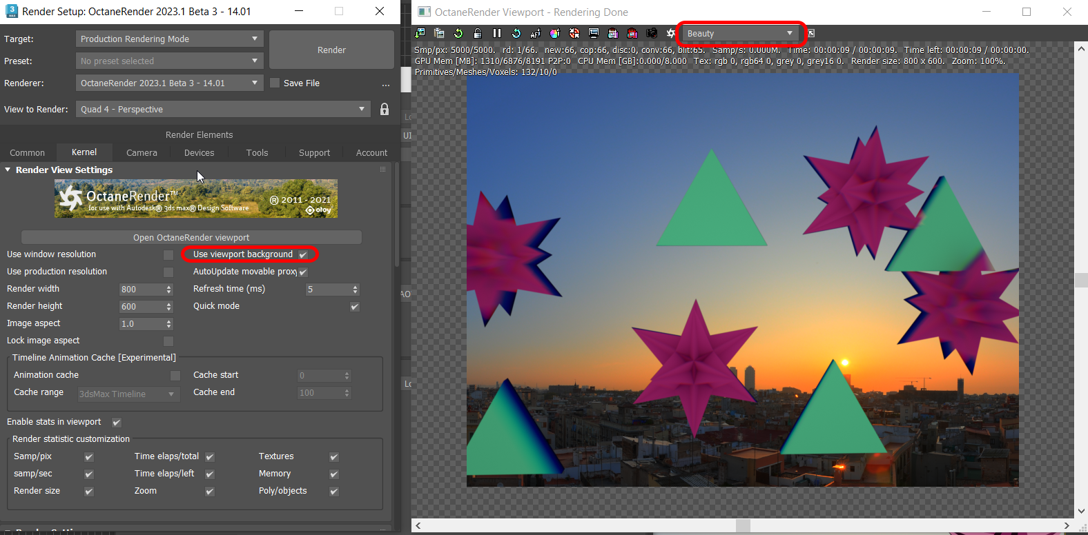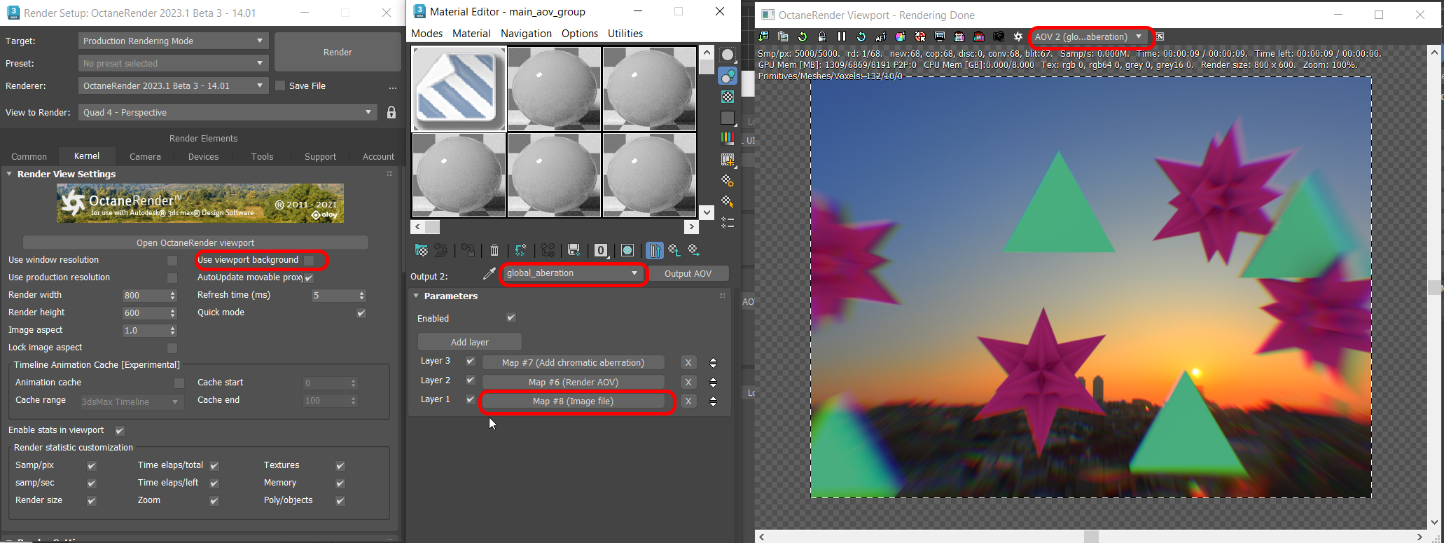 This output is then combined with the 3dsMax Background image, as in the previous case. AOV 2 and AOV 3 use an AOV Image instead of the 3dsMax background, so the 'Use viewport background' should be disabled.