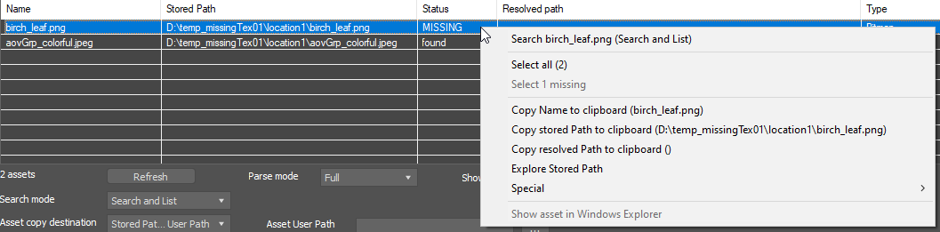 You then change to the 'Search and Rename' or 'Search and Copy' mode to actually fix the missing asset issue.