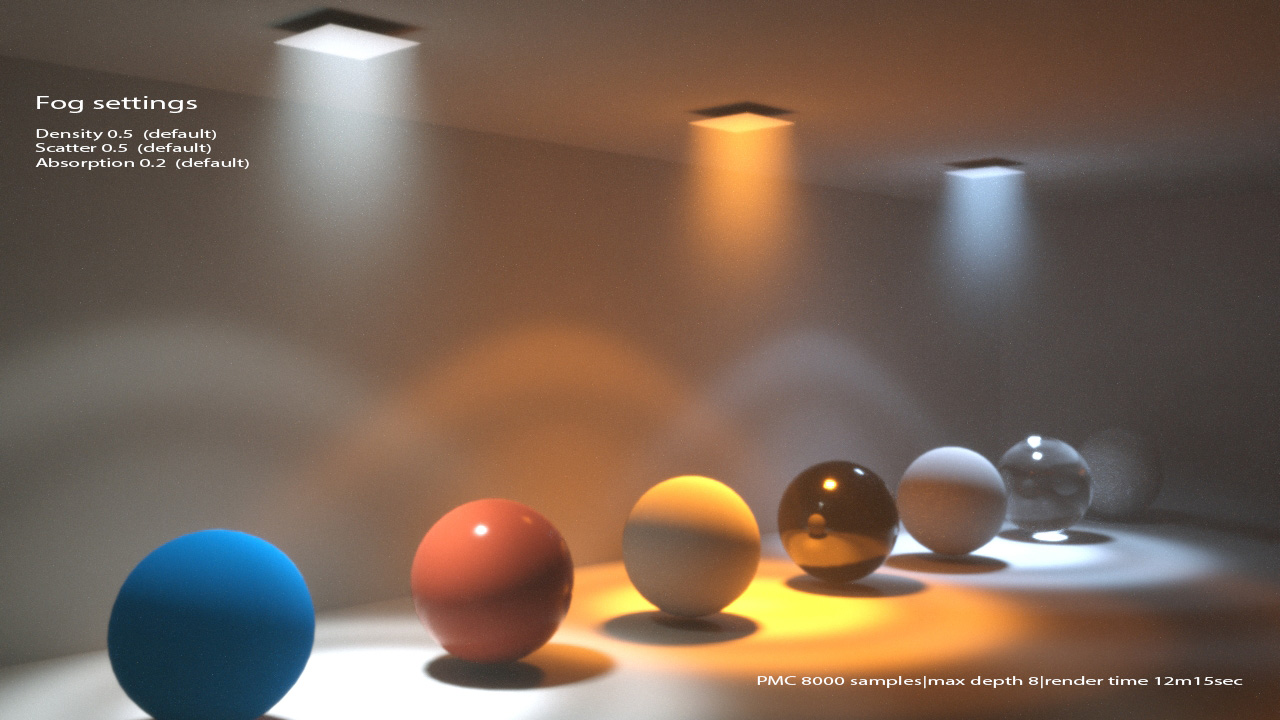 The size of my test set for these images is 2.1m from the center of the blue sphere to the end wall, so not very big, making the fog in all my examples quite dense.