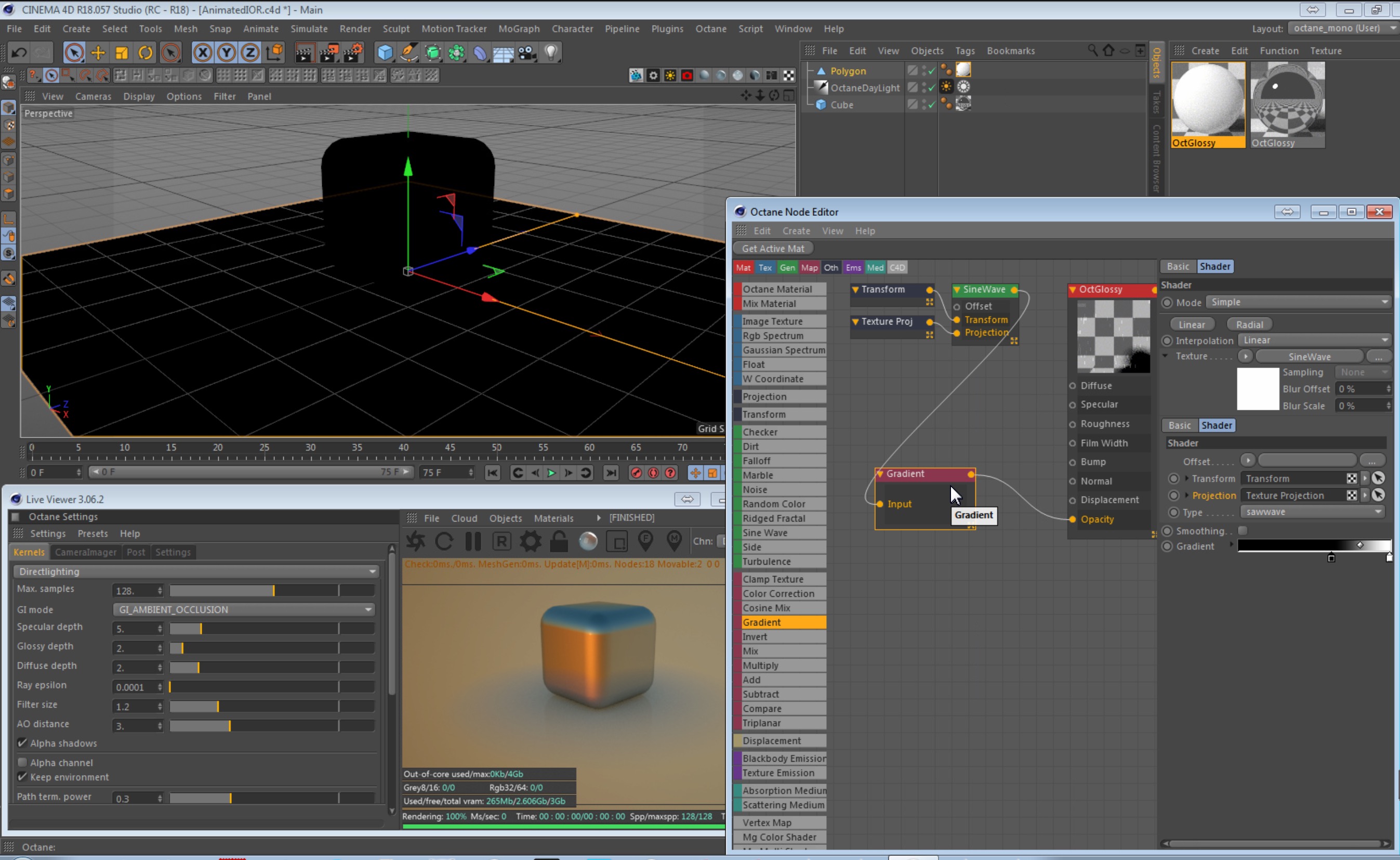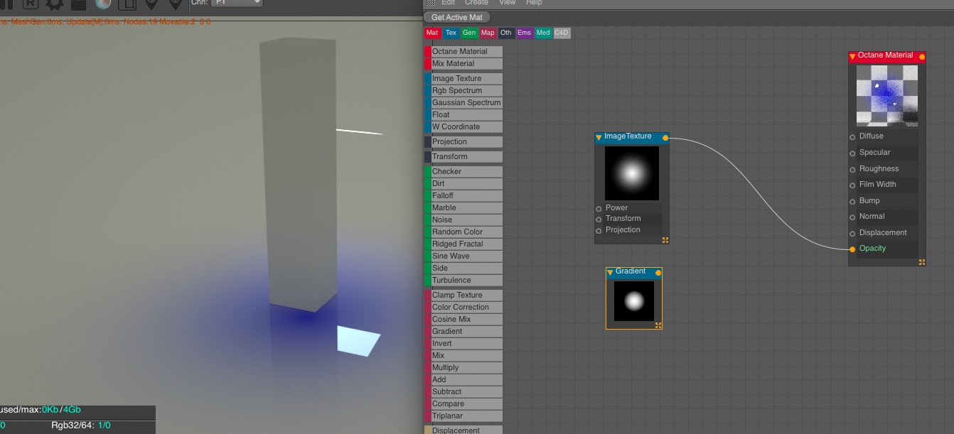 I created a reflective floor and have an object standing on it. I want to use a circular black to white gradient in the opacity channel to fade the floor and reflection away at the edges.
