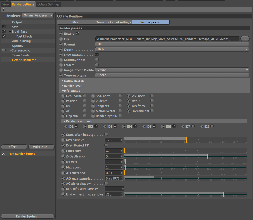 Thanks Thomas! I'll try this later tonight. As long as I can get the two passes to line up pixel per pixel then I'm fine with blurred renders (I just need the UV data to retexture an object post render). I was planning on doing a tutorial involving 360 content, Octane/C4D, and After Effects, but with this issue, I'll have to hold off until v3.