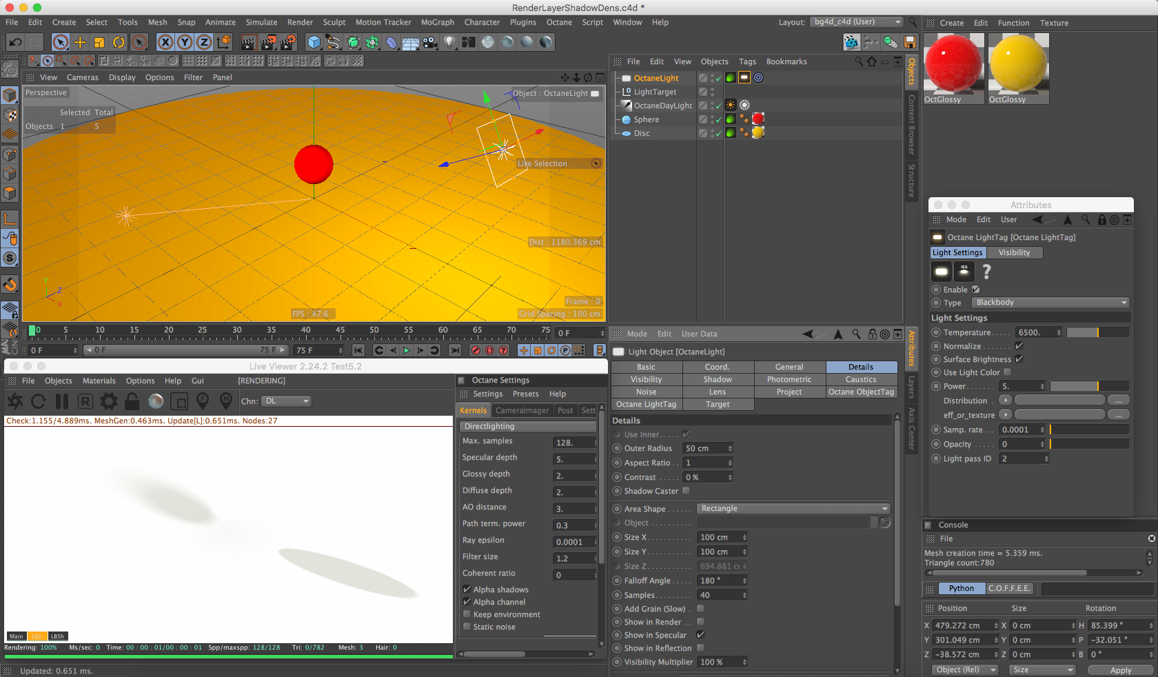 Im working on a project now, where I have an object standing on a floor. I need fill-lights in my scene to achieve the look im going for. In compositing I need it to be on a completely clean background with just the shadows. I don't know how to achieve this with octane without doing 2 renders: 1) turn off all lights except the light casting the main shadow and render. 2) turn on all lights and render the beauty pass with alpha.