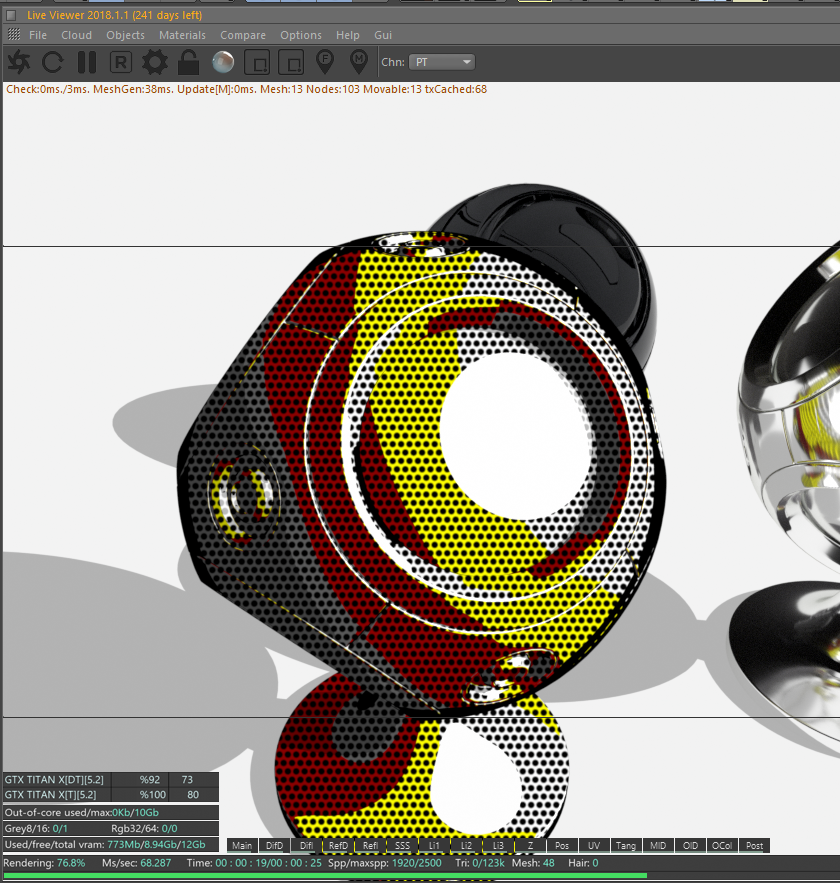 I have two toon materials and try to use ToonRamp shading information to mix them. The point is - I want the dots to appear only on a specific color of shading. Octane Blending material unfortunately doesn't accept ToonRamp as an input.