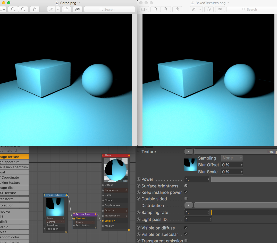 On the left is the source scene, one material, one light source. On the right is the same scene with three materials, each flat black with the baked textures driving surface emission, and no other light sources.