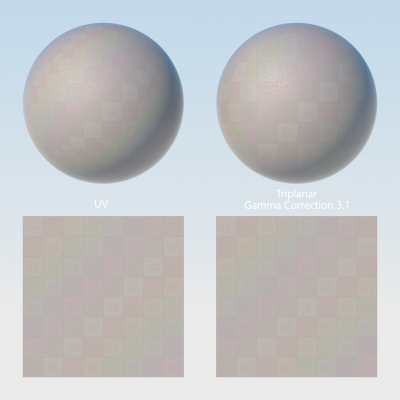 Hi Andreas, the images cannot match, based upon the way you have it set up. The UV cube and sphere image maps are scaled at 1.0, but the Triplanar cube and sphere image maps are scaled at 0.05. That scaling is significant, and you will see some differences as a result. Your gamma correction attempts to resolve the differences, and that is a reasonable approach to take in this scenario.