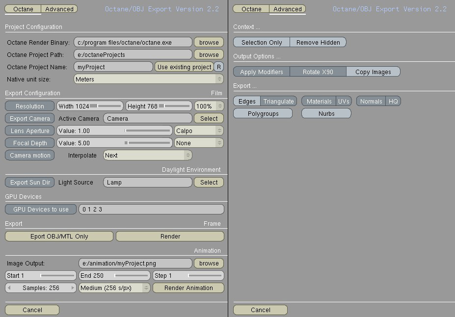 The Lens Aperture and Focal Depth values are overrided by the IPO curve value for each animation frame. As in Blender the Aperture value cannot exceed 2.0, be sure to not set it higher, the curve value will be multiplied by 100 during the exportation.