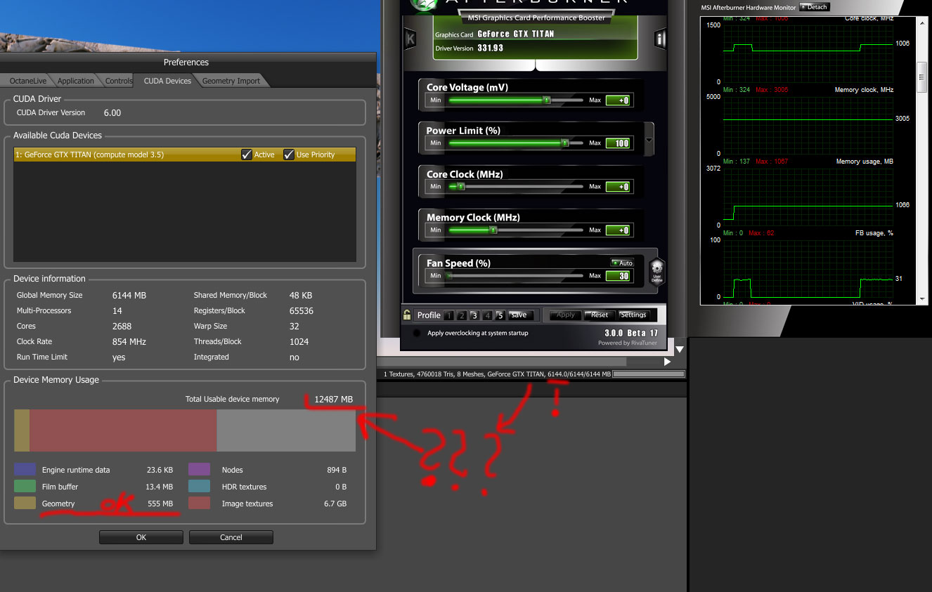 Actually I don't know when exactly it happened but it did. Here is the screenshot. And what funny is that total vram for my Titan is 12GB - nvidia was so generous giving me extra 6GBabstrax wrote:Does it happen all the time? If yes, what exactly does the memory usage say (all 3 numbers) and what is reported in the CUDA device tab of the preferences dialog?smicha wrote:I confirm that too. MSI afterburner shows correct values of varm usage while Octane hits incorrect 100%.manalokos wrote:The program indicates always that memory is 100% occupied 3072/3072 MB but it renders. So memory monitor is not working correctly.
