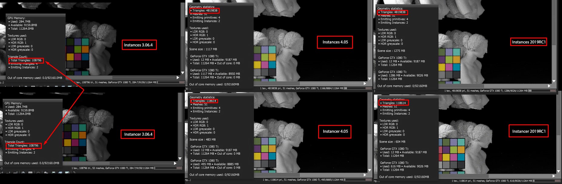 Please also pay a close attention on memory usage at the same scene? 3.06 uses close to 285mb, 4.05 uses 495mb and 2019RC1 uses 616mb
