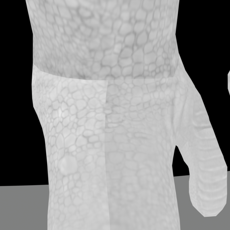 The second problem are the gaps at the UV seams. These seem to be caused by different displacement heights for adjacent triangles: Looking at the displacement map itself, it seems to consist of some detailed map and some super-blurry layer underneath that causes these offsets.
