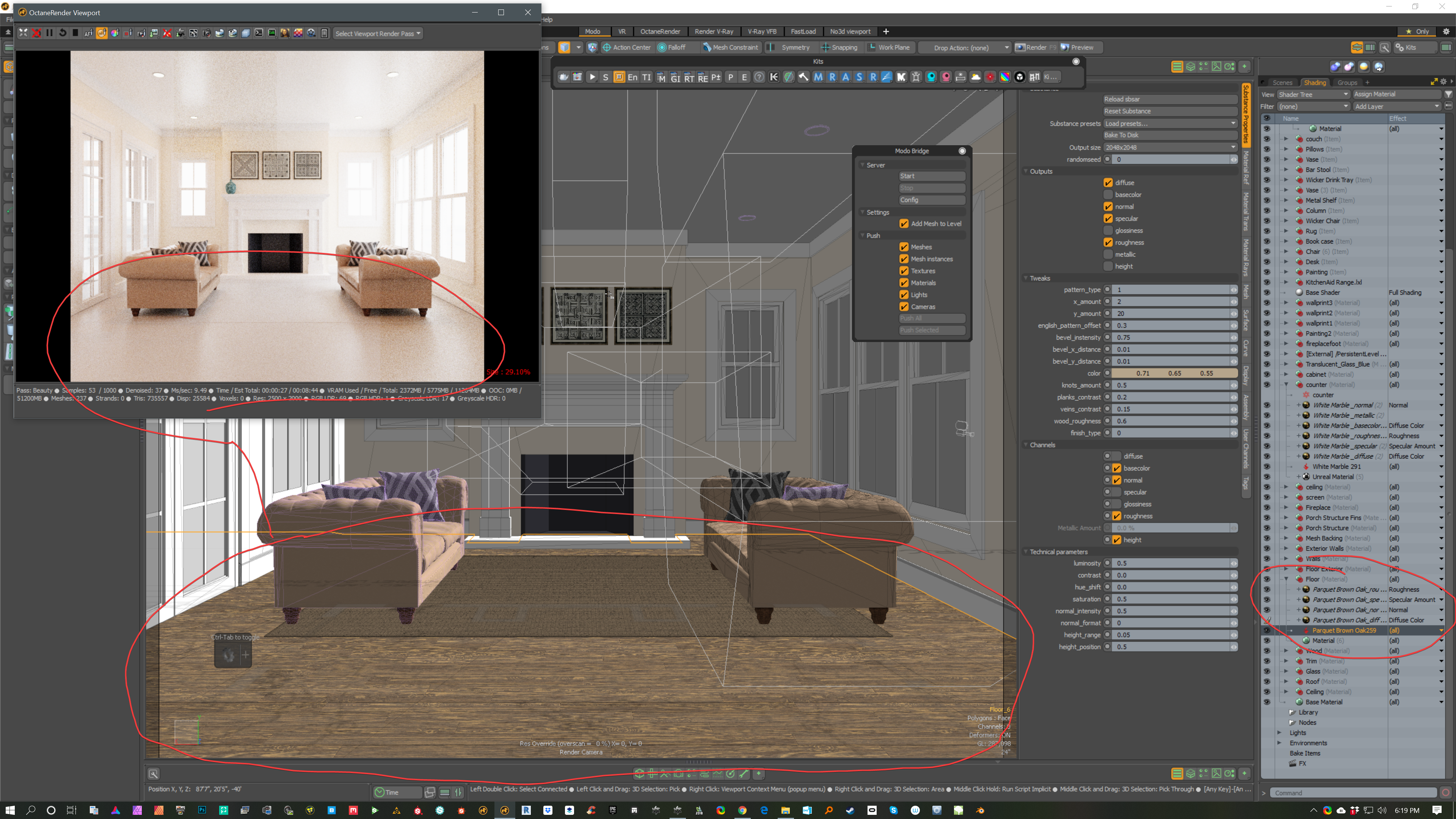I downloaded this sbsar file from the SubstanceShare website and added it to a ground plane in modo: Modo's render looks correct: The octane render looks ok until the normal and basecolour outputs are added. I've added the outputs one at a time: