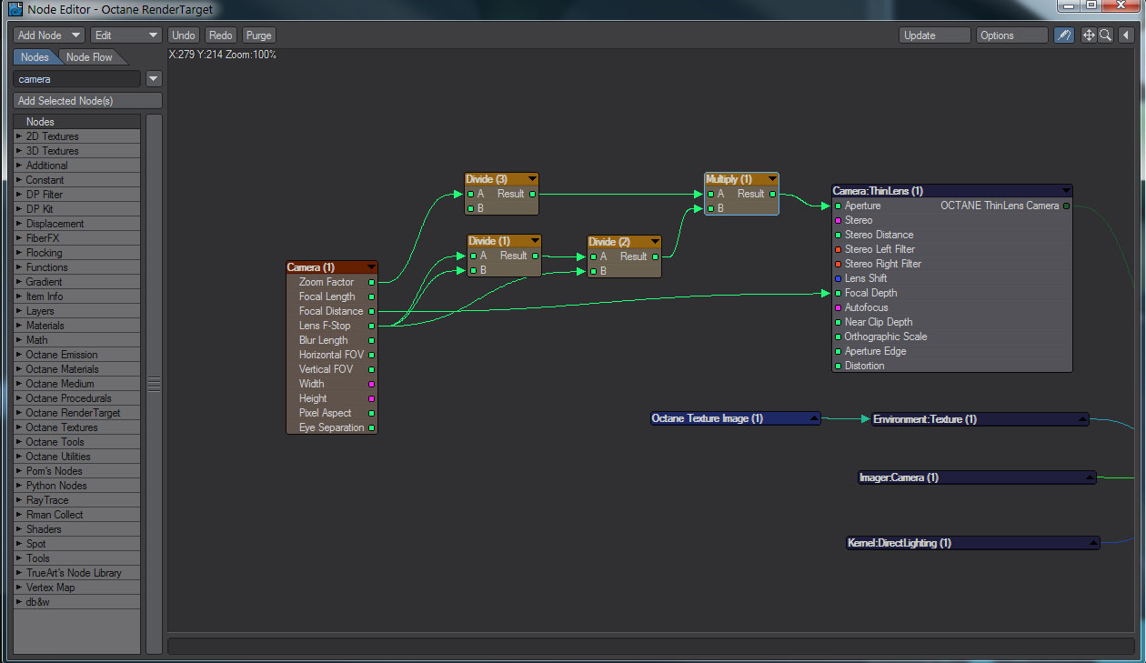 The Lens F-Stop (amount of defocus) is also controlled via the LW camera DOF panel. No modifier here though, just enter a number and it ties into Octane later in the Editor. This next step was a bit tricky (for me anyway I'm very much mathematically challenged) Octane's aperture setting works inversely to Lightwave. If both LW F-stop and Octane's aperture settings are set to 1 the defocus matches. A LW F-stop value of 0.5 = Octane Aperture setting of 2. A LW F-stop value of 0.25 = Octane Aperture setting of 4, and so on. Halve the LW F-stop and double the Octane setting to get the same defocus effect. Back to the octane editor drop in a divide node. In the LW camera node added earlier, connect the 'Lens F-stop' output node to both the A & B inputs of the divide node. This divides the LW fstop number by itself, but you need to do this twice. Copy and paste the divide node, connect the 'result' from the first divide node into A of the second divide node, and in the B input, connect the Lens Fstop node from the LW camera. ie: LW fstop number of 0.5 divided by 0.5 = 1 divided by 0.5 = 2.
