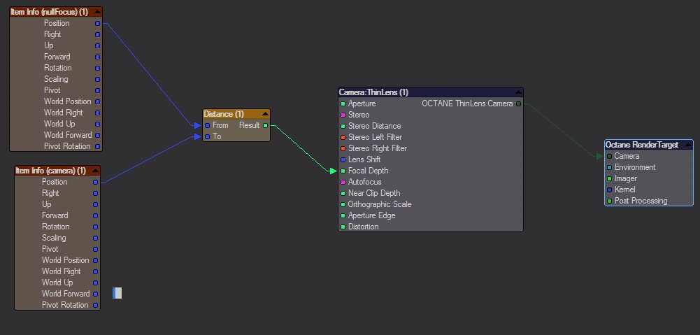First thing to note is the Focal Depth is controlled in the usual Lightwave way ie: targeted to a null via proximity modifier in the LW Camera DOF panel. Add a null for the DOF Target, parent to camera and disable the null's rotation HPB, scale XYZ and Position XY.. you only want to move this along the Z axis towards and away from the camera. I added a 'shape' custom object to the null so it's easier to see in your scene. Open up the octane editor and drop in the 'Camera' node (Item info-->Camera) double click and select 'Render Camera' Connect the focal distance node output to the focal depth input of thinlens camera. Boom- focal distance now mathches.