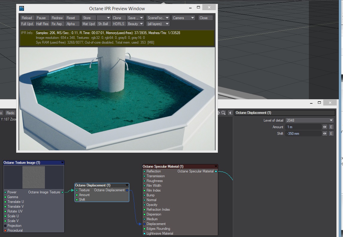 - Octane only supports displacement using the object UV map. The projection node doesn't work for the displacement, so you need a proper UV mapped mesh. As you can see in the attached images, the UV available for the water surface is not right for rendering, you need to apply a Y axis planar projection in the modeler first.