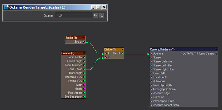 Remembering that, on a real world lens, a stop of 1.3 or 16 or whatever, is ACTUALLY 1/1.3 or 1/16, I tried plugging in a little scalar divide node to link the f-stop to the Aperture. Basically dividing the number 1 by the f-stop value and feeding that into 'aperture' , and lo and behold, we actually have a photographically correct camera again! (well, we always had it, I just didnt realise how to get it.)