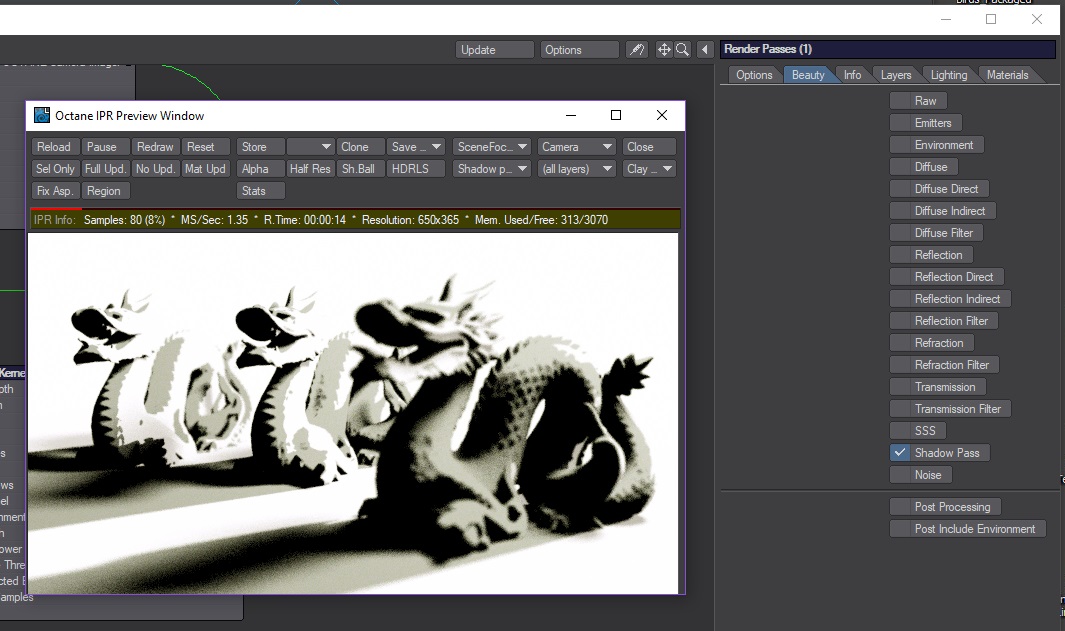 4. I then start IPR and see the Beauty render normally. In IPR I select under Beauty-tab "Reflection". I see only reflected surfaces. Cool! Then I select Render Layer ID. I see the black bg and red alpha objects. Cool! Then I select Shadows. I only get white screen with no shadows. Not cool!