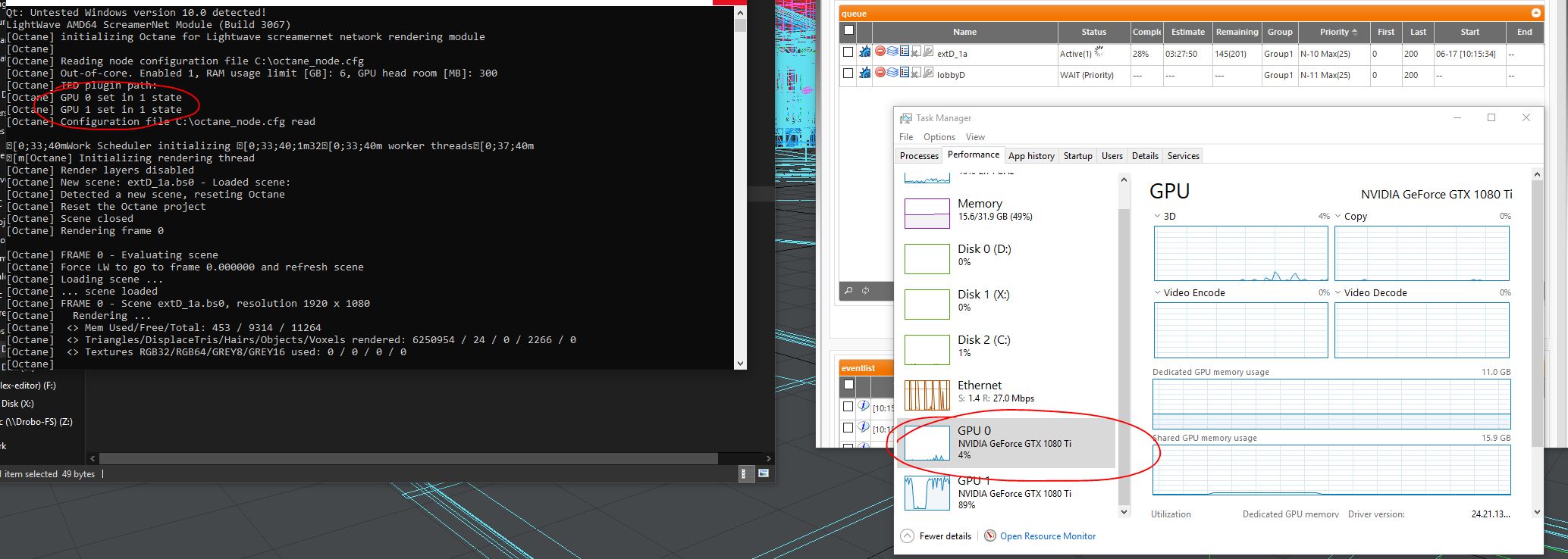I was just looking around while rendering and noticed out of the two GPU's I have installed only one is being used during LWSN rendering. As you can see both are being setup correctly on initialization from the octane_node.cfg file.