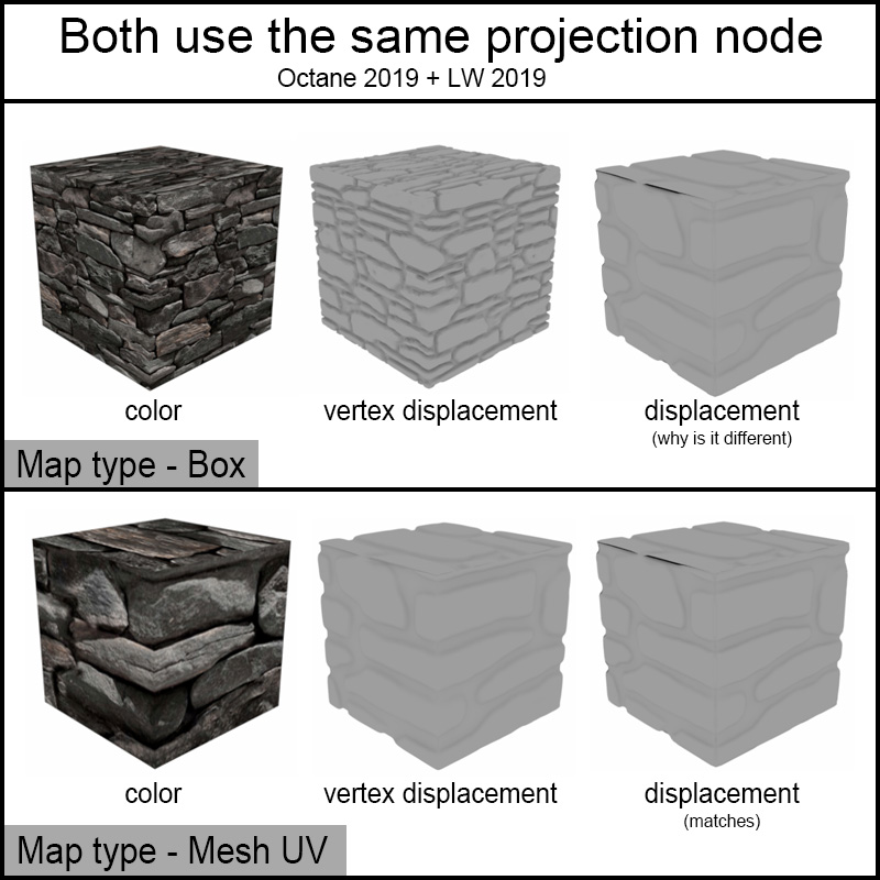 I've noticed that you seem to be able to use the Octane Displacement node, on geometry that hasn't been UV mapped, when you connect the Octane Utilities UV Map node to the Normal input on the root Surface node. So doing things like cubic mapping by using UV Map node, instead of a projector node, seems to work okay with displacement, so far. The IPR doesn't seem to automatically refresh when you change various values in the UV Map node, so you need to have the scene do a full reload.