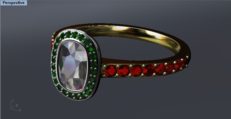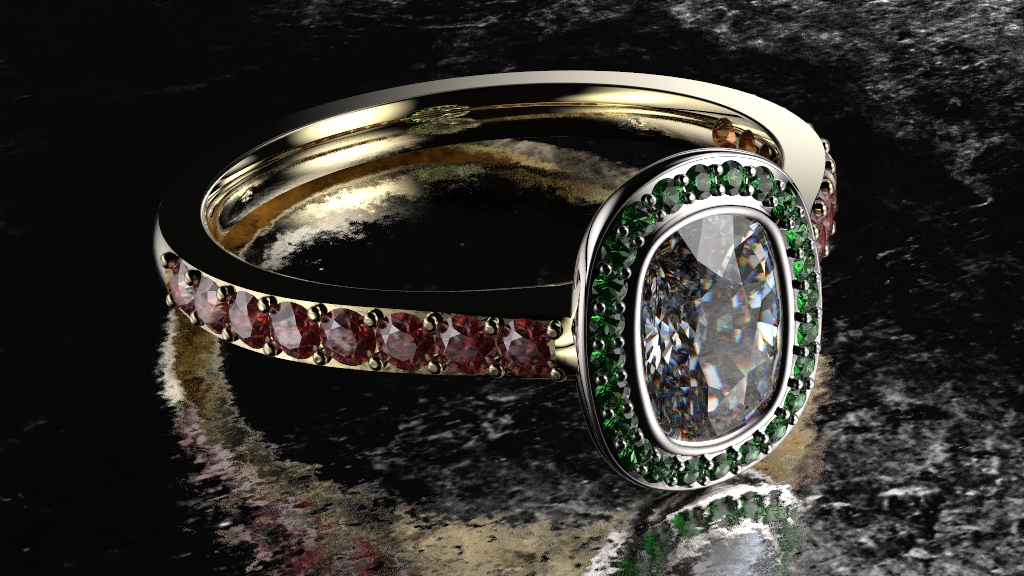 So what did i do so far? everytime my model is done, i make sure each material is on a seperate layer which is called like the material i wanna apply to. Alll the parts that will be one material (for example my gemstones) are also grouped. i also apply materials from rhinogold to it. you can see how it looks like in the pictures under this text: (Rhino Materials and RhinoShaded)