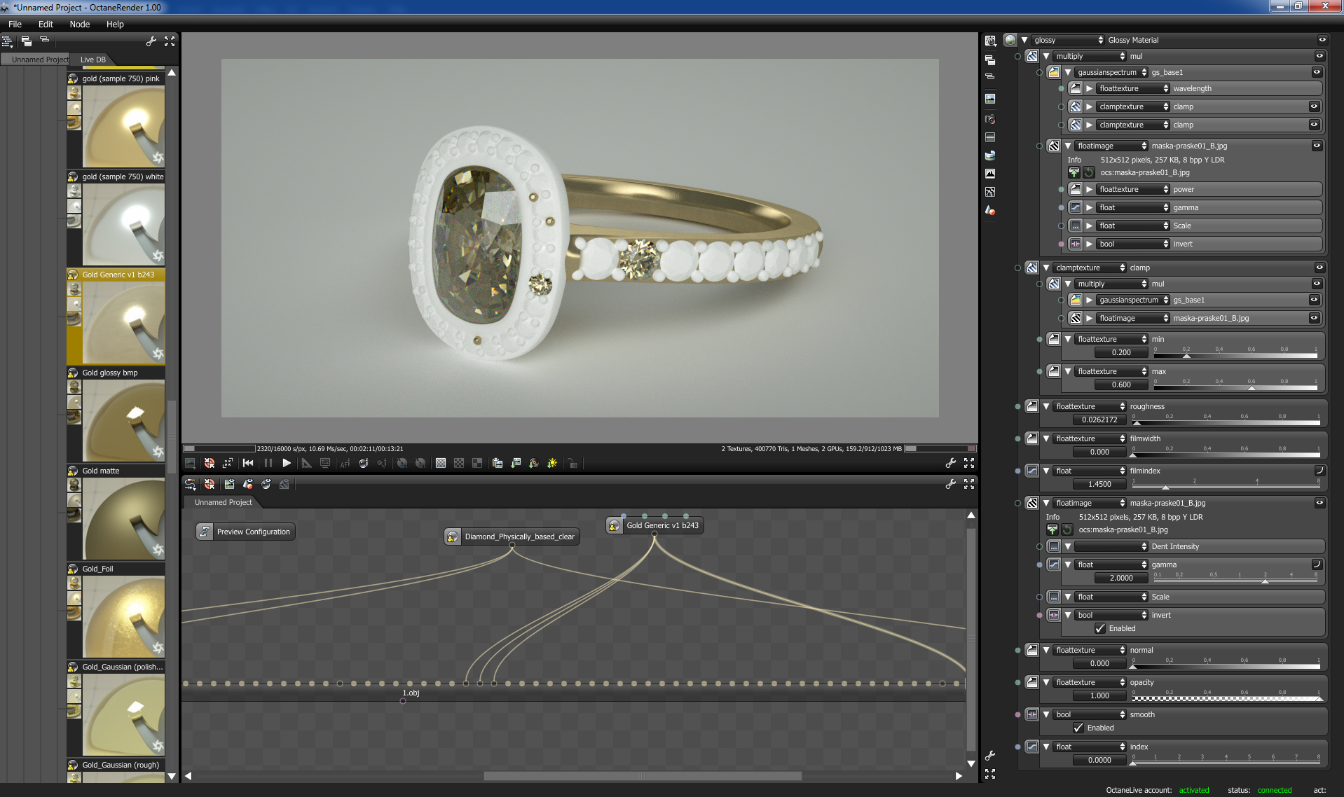 If i then drag n drop the created obj file into Octane i get a 9999999999999999 different Materials. Each gem stone is seperate, each prong, and so on. applying Materials to each and every part???? Takes muuuuuuuch to long. Thats no workflow. i need it like in for exapmle keyshot. 6 different Materials and DONE. This is an absolute no go. no one who will need it for business, can work like that. no way! It looks like this when i import: (Octane 1)