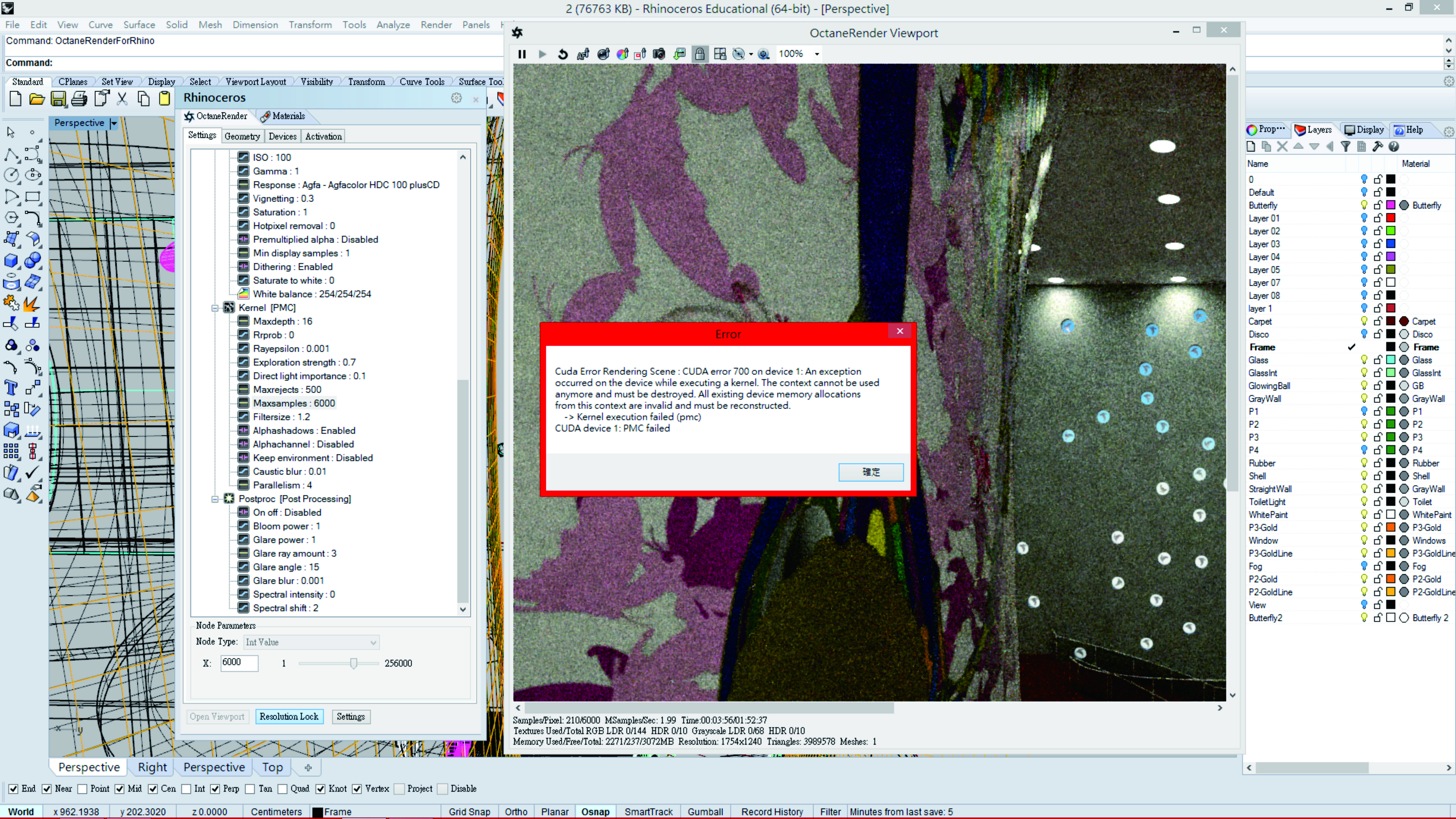 I suspect there is a geometry structure in the which is triggering a fault in Octane. Would it be possible to send the scene to me pls? Then I can save as ORBX and submit it to Otoy for further analysis.Everything was working well, even a bug i have encountered while using ver. 1.50 which pops up on every frame when I'm rendering a animation( Some thread in the forum has the same issue i suppose) is fixed. Yet today I have encountered a problem while rendering with OctaneRenderViewport. A box poped up saying there is a CUDA error 700 on device 1 and the core clock on my second graphic card(which is the so called device 1 I think) dropped down from 1200 to 549 MHz immediately and stucked there. I tried to restart rhino and OctaneViewPort again again but the card is still slowed down and can only be solved by rebooting my system(but the same thing happened again when i tried to render the scene). I'll try to find out if it's a hardware issue while waiting for your reply.