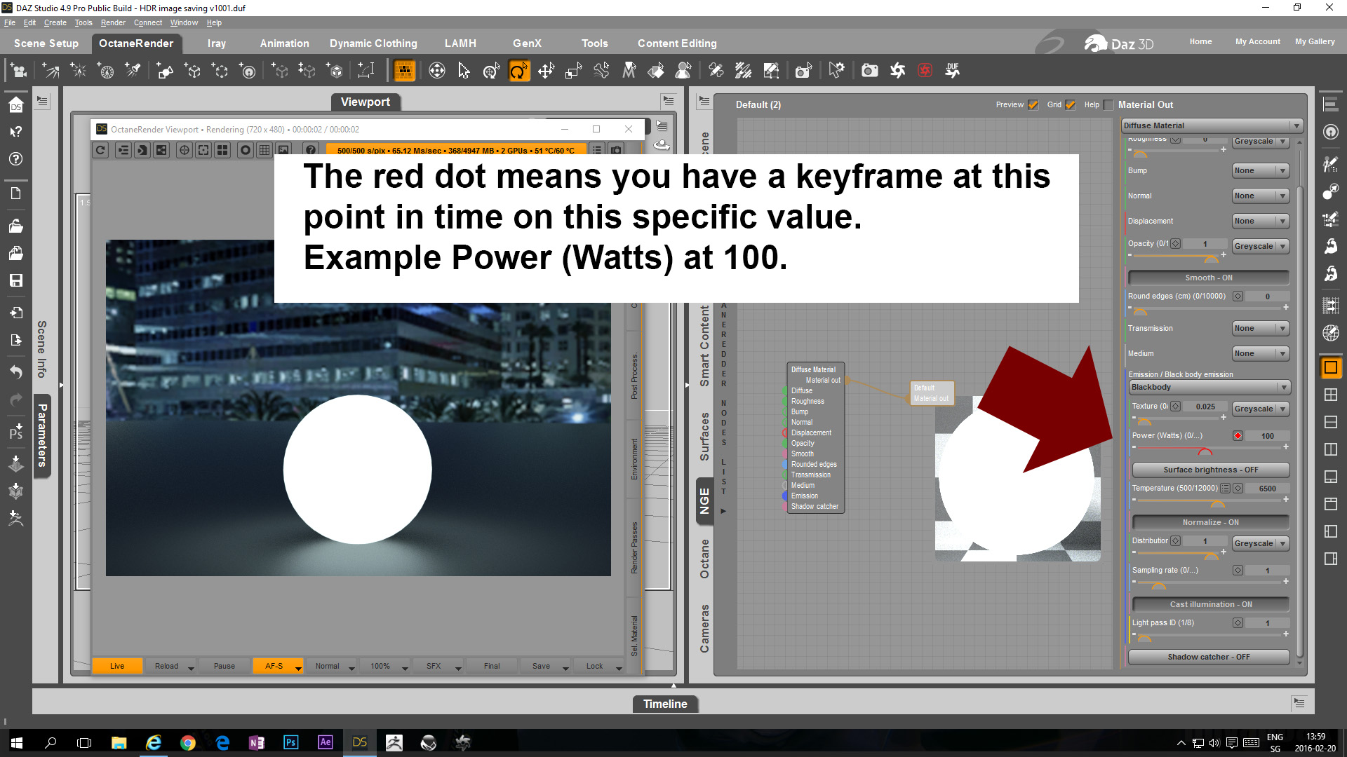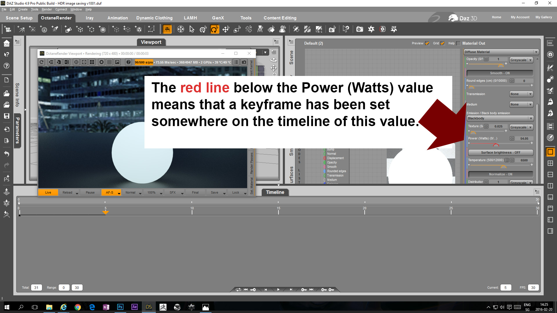 + If you scroll the timeline to 5 frames the only indication that there is a keyframe set at some point in time is the red line below the power parameter.