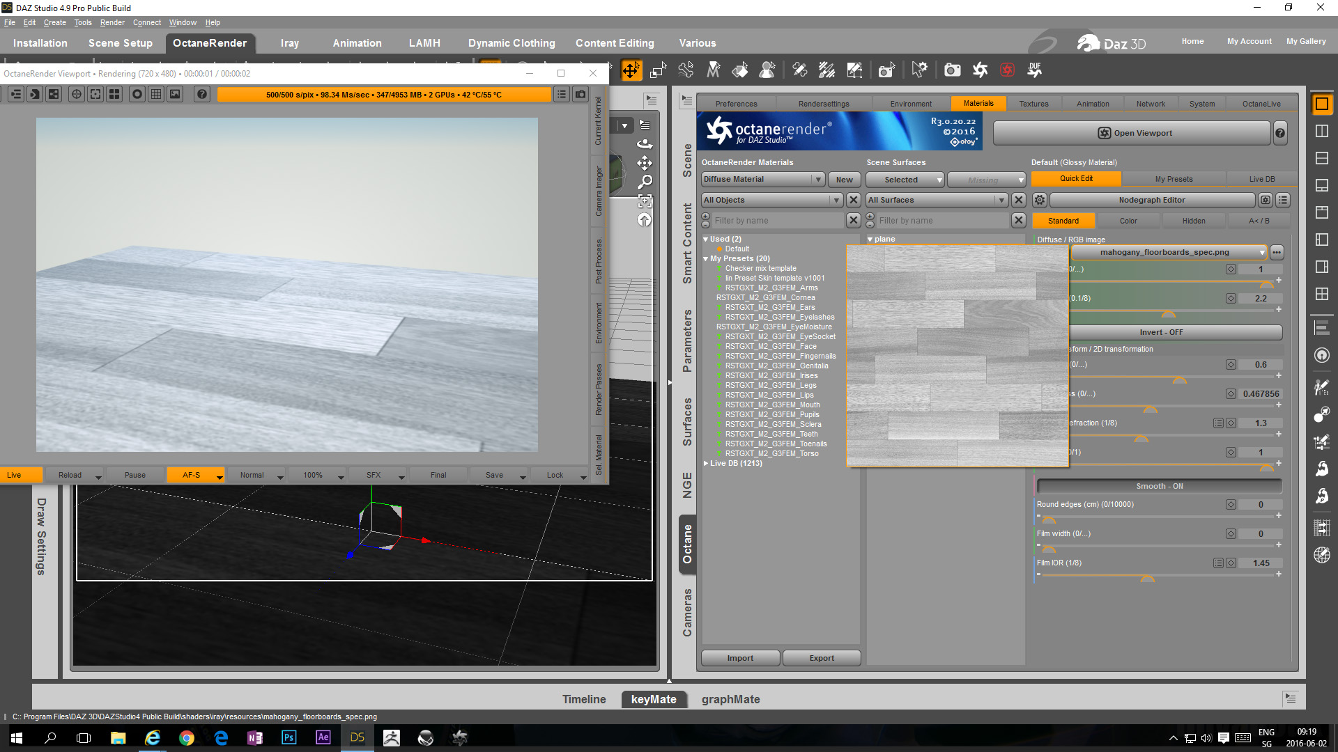 Replace maps missing test scene 01& 02 show the result of applying the presets to a new DAZ Studio scene with different diffuse maps applied to the plane.