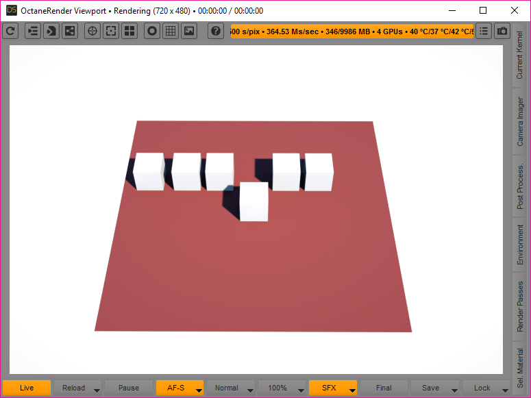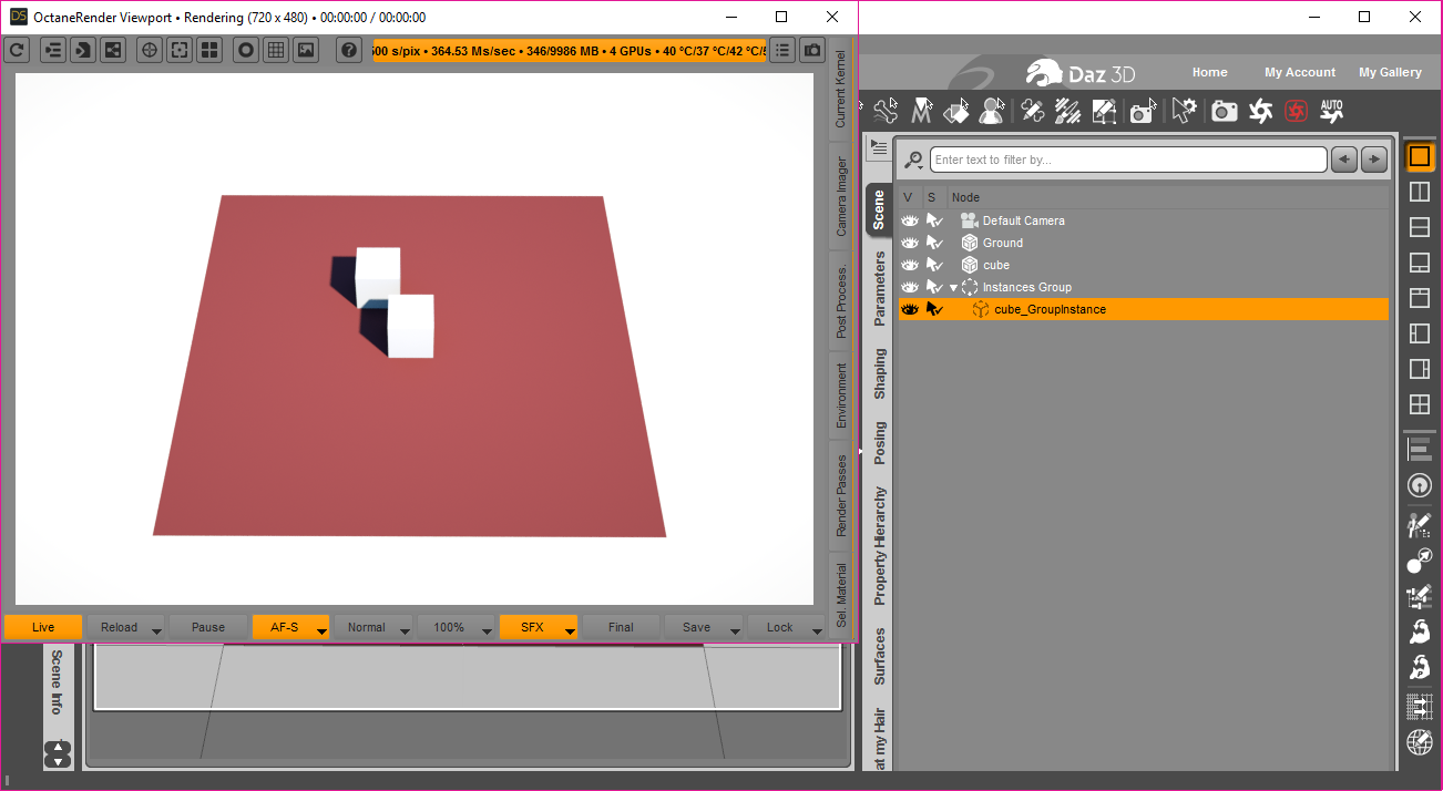 Both DAZ Viewport and Octane Viewport show 6 Cubes each. The one in front is the original cube and the back row is the instances. 3. Select all the 5 instances in the scene panel and click "Group Like Sibling Instances" under the Edit menu. 4. DAZ Viewport continues to show 6 cubes and in the scene tab it shows the grouped "cube_GroupInstance" But Octane Viewport now shows only 2 cubes: Now it may be because the Octane plugin is wrongly reading the coordinates and rendering them all at the same place instead of taking the individual coordinates of each cube like DAZ is doing or it may it is actually not seeing the other cubes.
