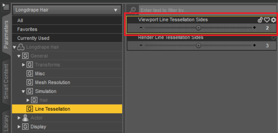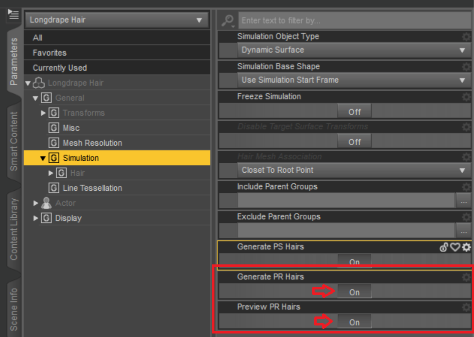 Under the Simulation section of the Parameter settings for the hair object or its cap, ensure Generate PR Hairs and Preview PR Hairs are toggled to on. I believe this create a hair figure in Daz from the strand based hair. This hair is still not visible for me in Otoy until I increase the Viewport Line Tessellation Sides value to 2 or higher; this value can be found under the Line Tessellation section settings for the hair object. The hair figure gains more hairs, the higher this value, however this also appears to be quite resource intensive. If you set it too high, Daz will probably stop responding and then crash. I found that a setting of 2 was generally too low, allowing the character's scalp to be visible through the hair,.