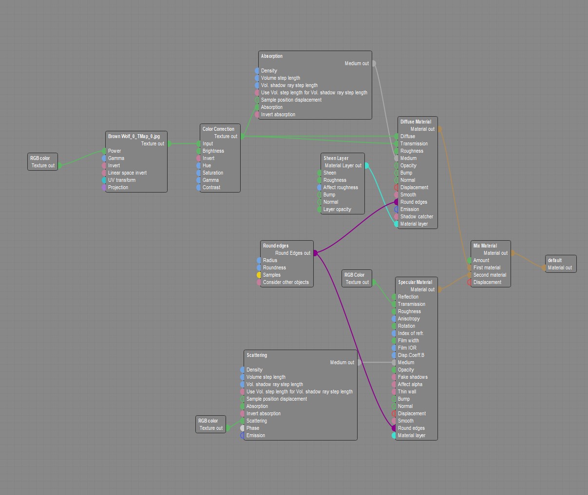 Basically in the Node Graph, you will see I am using a mix node with a diffuse and specular. There is transmission, Absorption and Scattering to add SSS to the hair. The specular node is used to add translucency and the shine. The transmission in that is different than what I am using in the diffuse. In diffuse I have a habit of using the same color in the transmission (or slightly darker using a color correction node if necessary specially when using whitish texture). I do this so that the transmission matches the fur color. This way darker part of the fur will have less transmission than the lighter part as it should be. You can play with different values to see what it actually does. You can ignore the rounded edges node, it is basically the default values for it. I added a Sheen node to the diffuse to add a little bit of sheen to the wolf's fur.