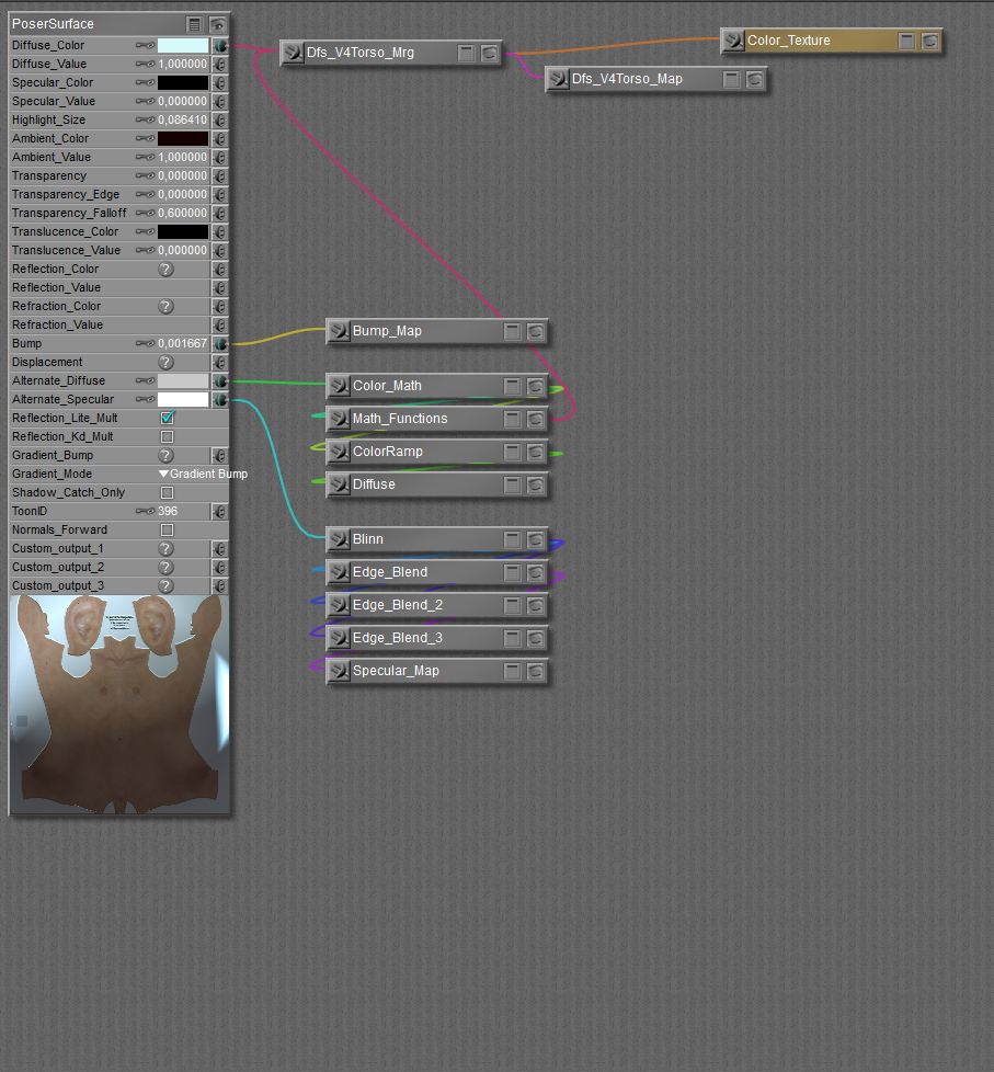 Would it be possible to see what Dfs_V4Torso_Map and Dsp_V4Torso_Map look like pls? Just flip open the preview of those nodes - that will give us a better idea.