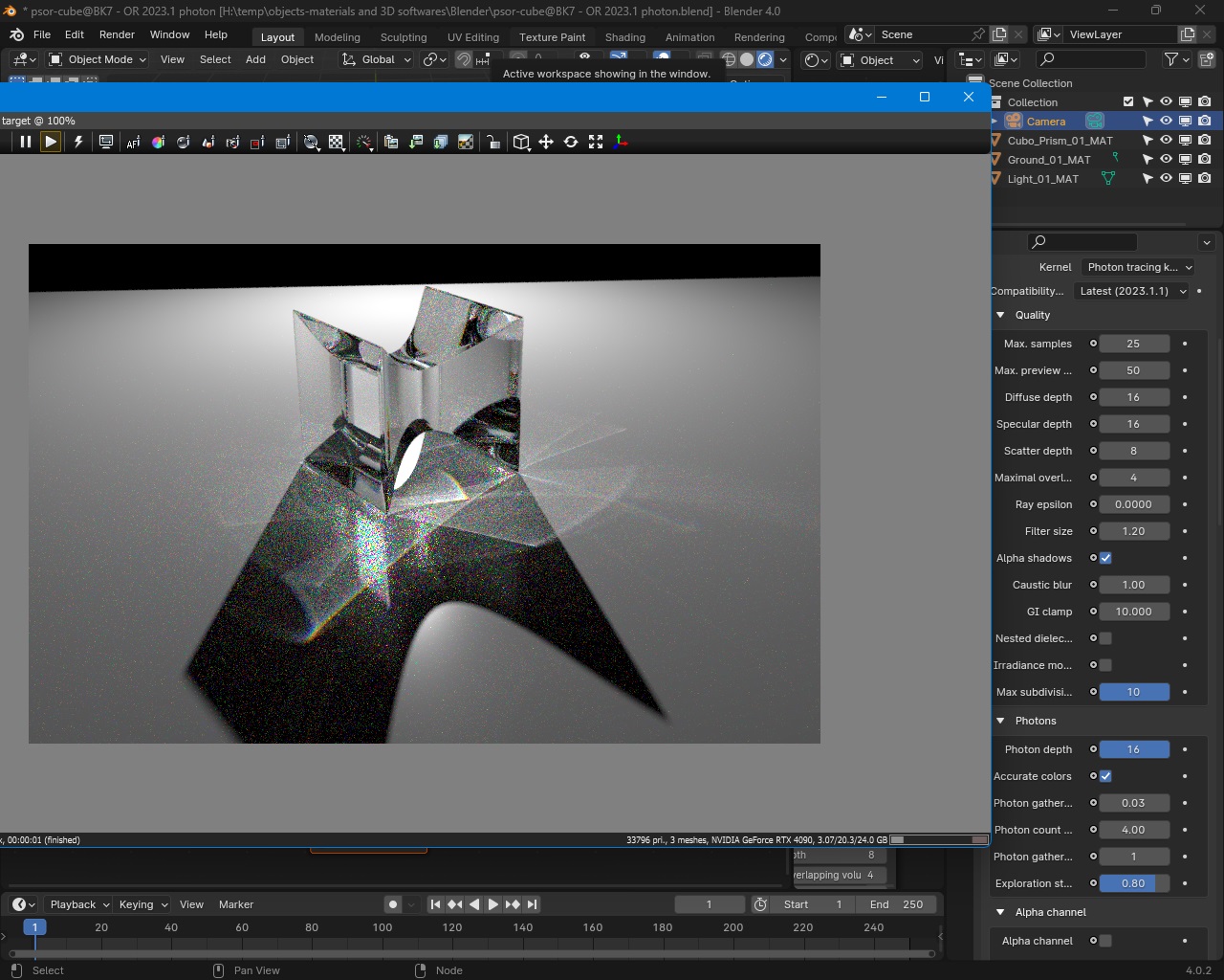 - Render kernals: path tracing (PT) for variable caustics and for lights reflected+refracted and photon tracing@radius 0.01 for fixed caustics