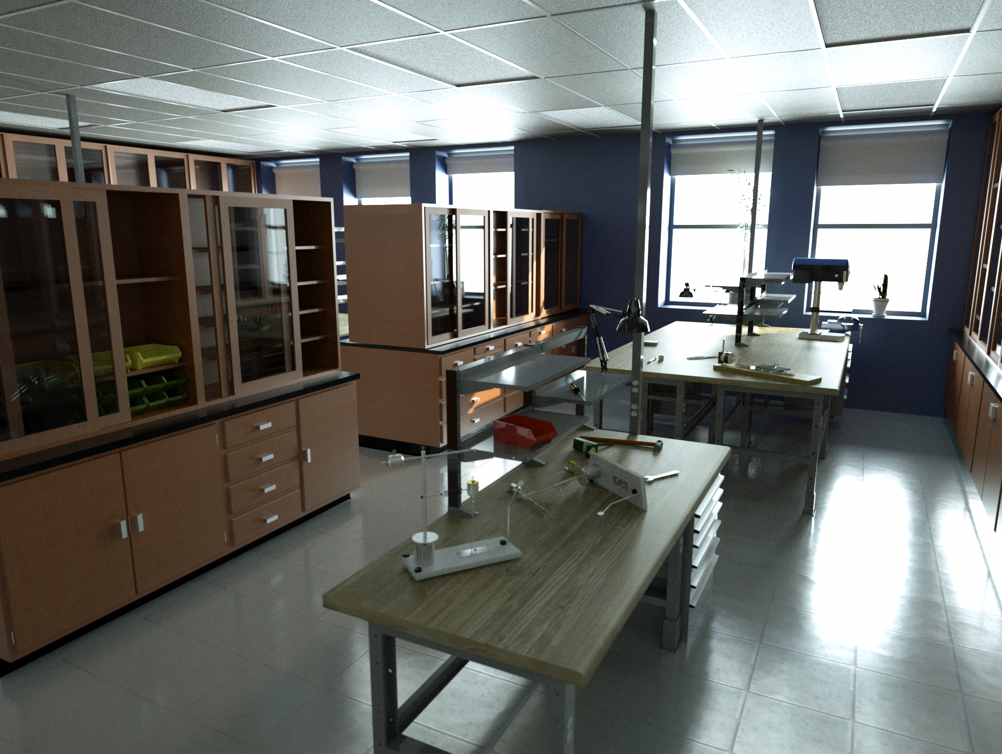 The geometry is made in Sketchup. The light come from a large black-body emitter outside with no glass in the windows.